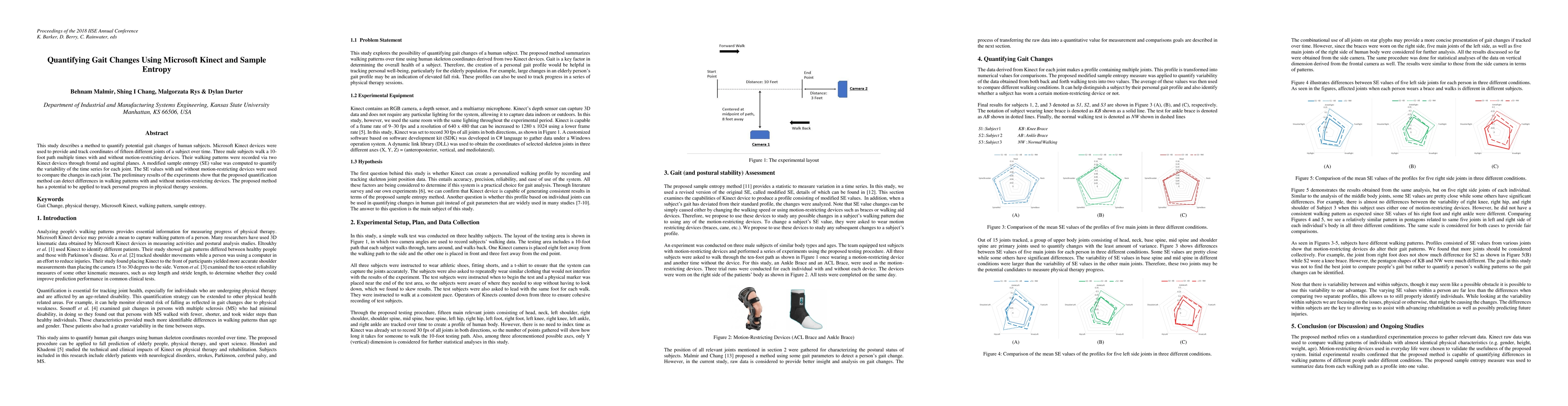 This study uses Microsoft Kinect devices to track joint coordinates and quantify gait changes via modified sample entropy. Preliminary results indicate the method can detect differences in walking patterns with and without motion-restricting devices, suggesting potential for use in physical therapy.