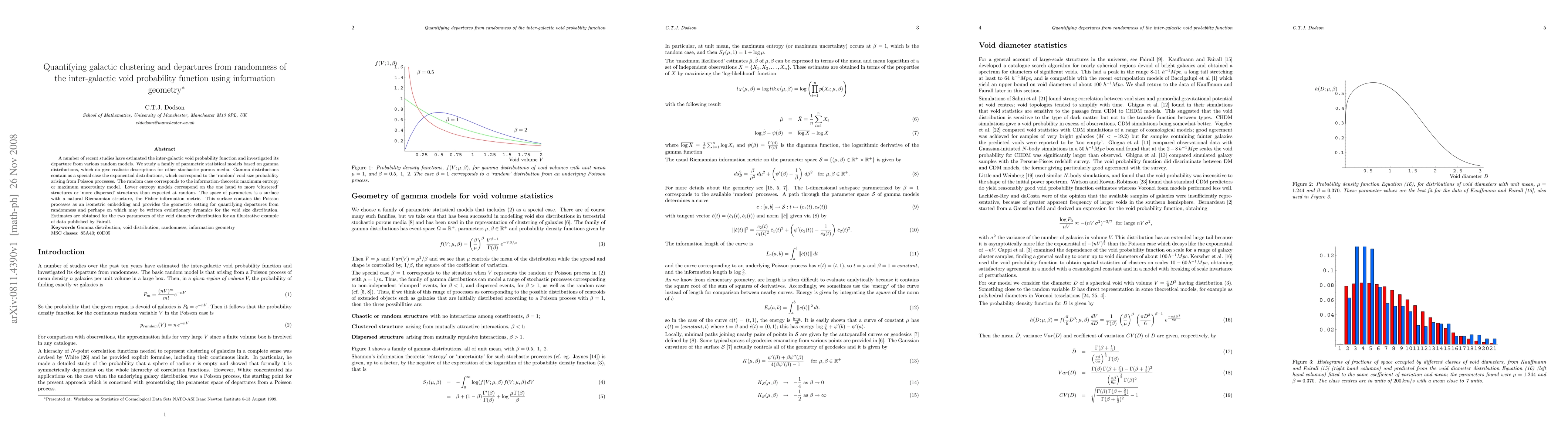 A number of recent studies have estimated the inter-galactic void probability function and investigated its departure from various random models. We study a family of parametric statistical models based on gamma distributions, which do give realistic descriptions for other stochastic porous media. Gamma distributions contain as a special case the exponential distributions, which correspond to the `random' void size probability arising from Poisson processes. The random case corresponds to the information-theoretic maximum entropy or maximum uncertainty model. Lower entropy models correspond on the one hand to more `clustered' structures or `more dispersed' structures than expected at random. The space of parameters is a surface with a natural Riemannian structure, the Fisher information metric. This surface contains the Poisson processes as an isometric embedding and provides the geometric setting for quantifying departures from randomness and perhaps on which may be written evolutionary dynamics for the void size distribution. Estimates are obtained for the two parameters of the void diameter distribution for an illustrative example of data published by Fairall.