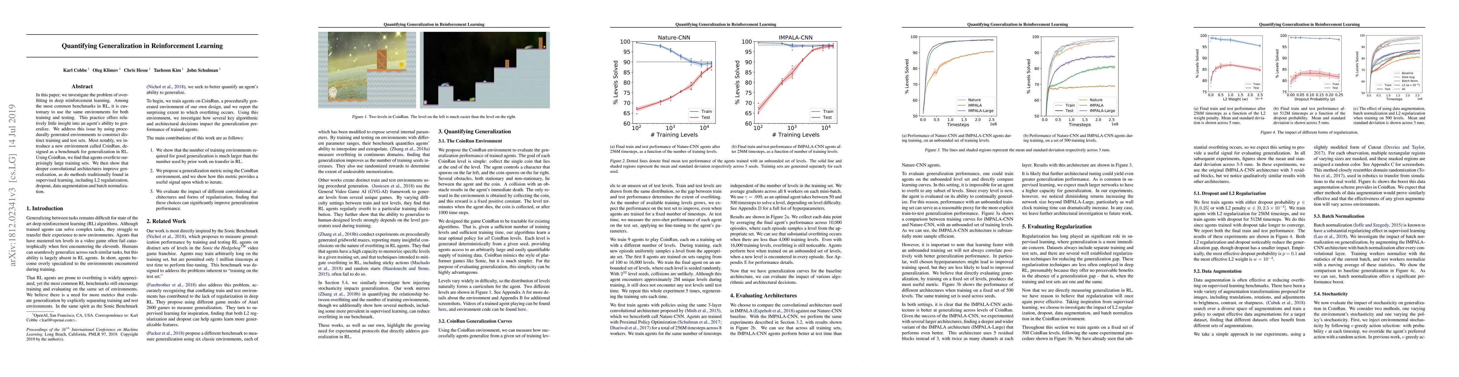 Researchers create a new environment test for reinforcement learning generalization, finding that deeper convolutional architectures and certain supervised learning techniques improve performance. They also discover that agents can overfit to large training sets.