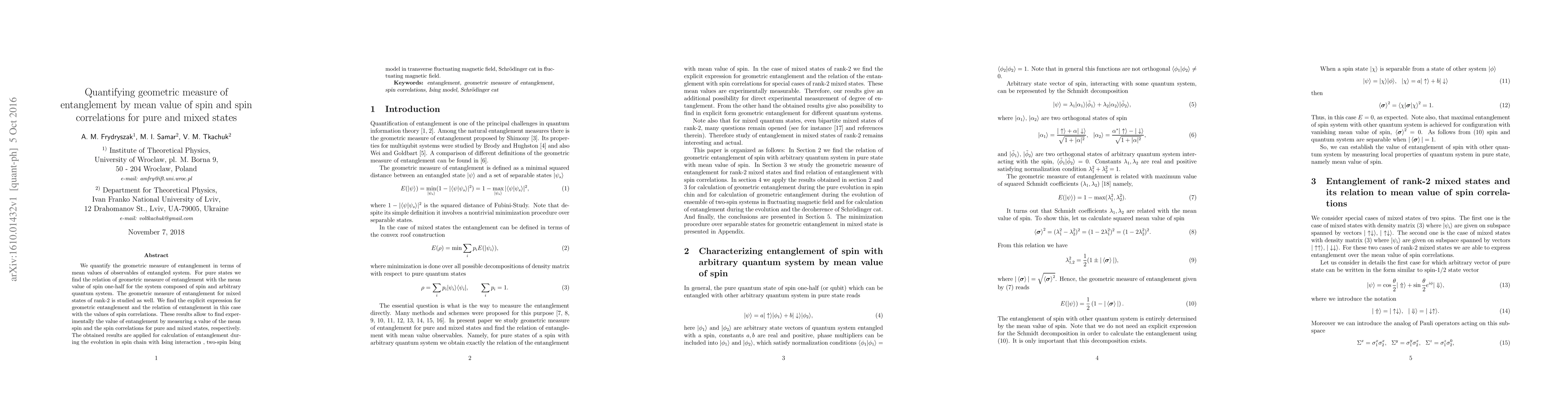 This paper quantifies the geometric measure of entanglement using mean values of spin and spin correlations for both pure and mixed quantum states. It establishes a relation for pure states involving spin one-half systems and provides an explicit expression for mixed rank-2 states, linking entanglement to spin correlations, which can be experimentally measured.
