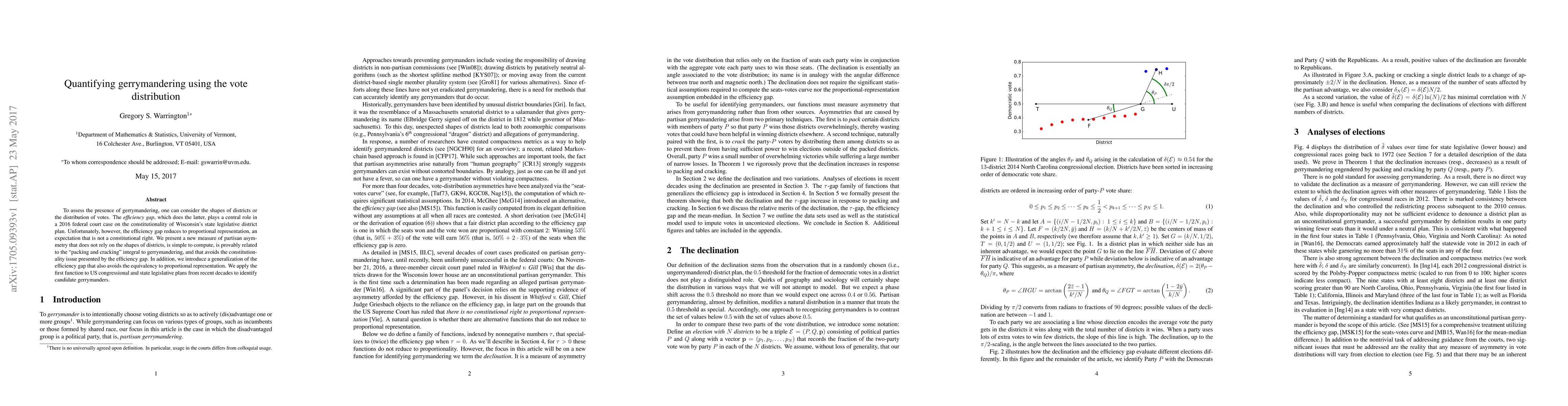 This paper introduces a new measure of partisan asymmetry to quantify gerrymandering, avoiding constitutional issues with existing methods, and applies it to US congressional and state legislative plans to identify candidate gerrymanders.