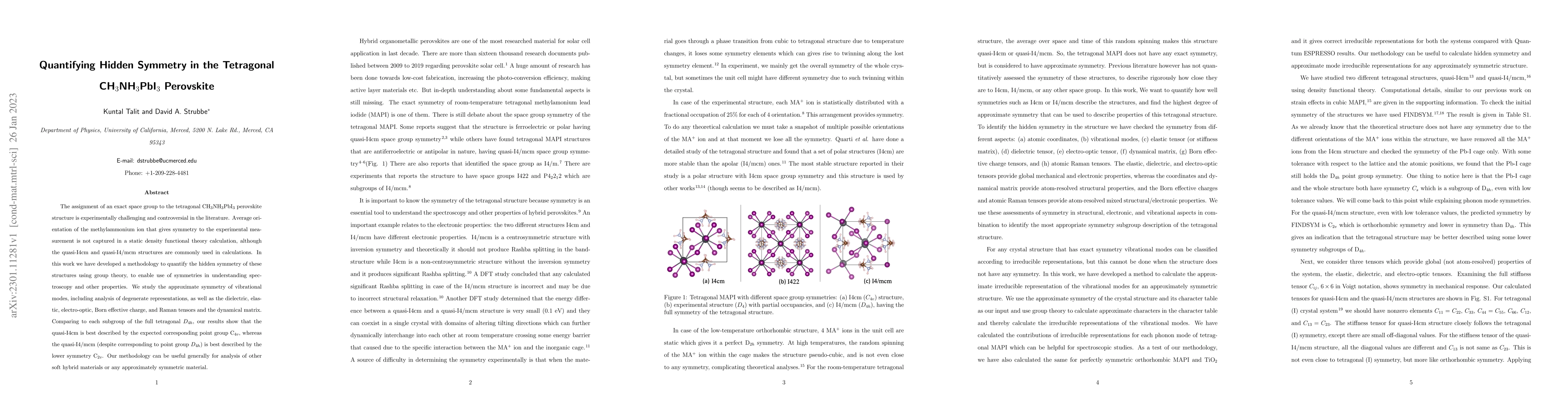 This paper develops a methodology to quantify the hidden symmetry in the tetragonal CH$_3$NH$_3$PbI$_3$ perovskite structure using group theory, revealing that quasi-I4cm corresponds to C$_{4v}$ and quasi-I4/mcm to C$_{2v}$ symmetry, rather than their expected D$_{4h}$ counterparts. This approach aids in understanding spectroscopic and other material properties.