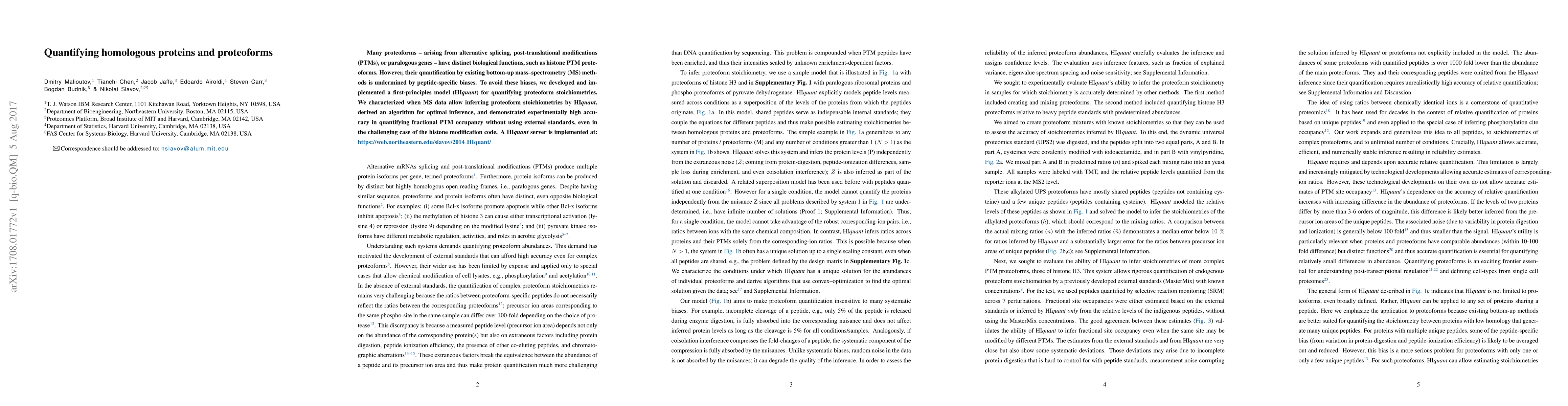 Many proteoforms - arising from alternative splicing, post-translational modifications (PTMs), or paralogous genes - have distinct biological functions, such as histone PTM proteoforms. However, their quantification by existing bottom-up mass-spectrometry (MS) methods is undermined by peptide-specific biases. To avoid these biases, we developed and implemented a first-principles model (HIquant) for quantifying proteoform stoichiometries. We characterized when MS data allow inferring proteoform stoichiometries by HIquant, derived an algorithm for optimal inference, and demonstrated experimentally high accuracy in quantifying fractional PTM occupancy without using external standards, even in the challenging case of the histone modification code. HIquant server is implemented at: https://web.northeastern.edu/slavov/2014_HIquant/