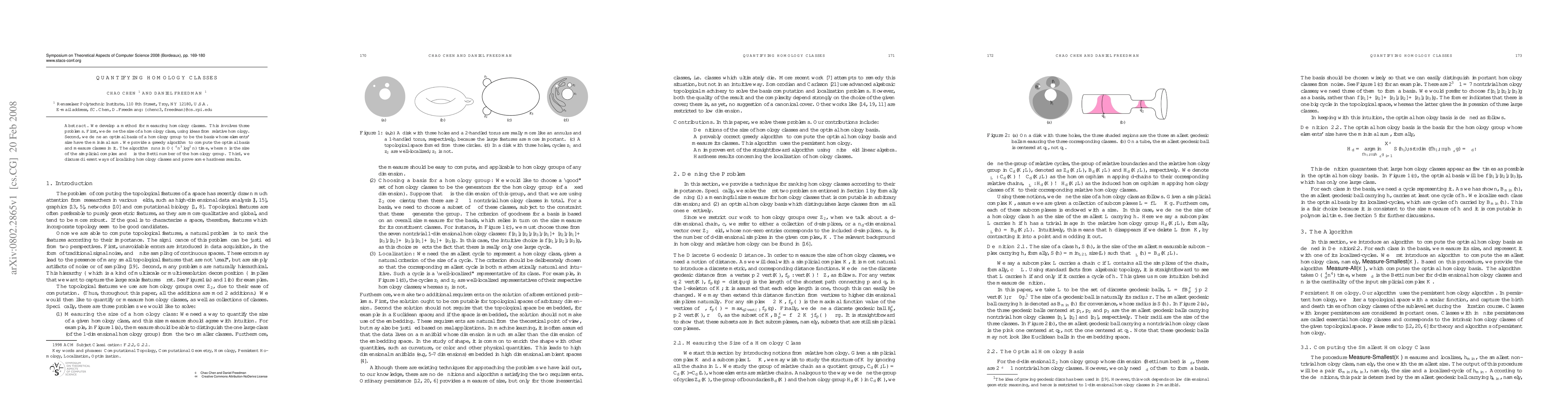 Researchers developed a method to measure homology classes by defining a basis with minimal sum element sizes and providing a time-efficient algorithm to compute it. The approach enables localization of homology classes and has implications for understanding complex systems.