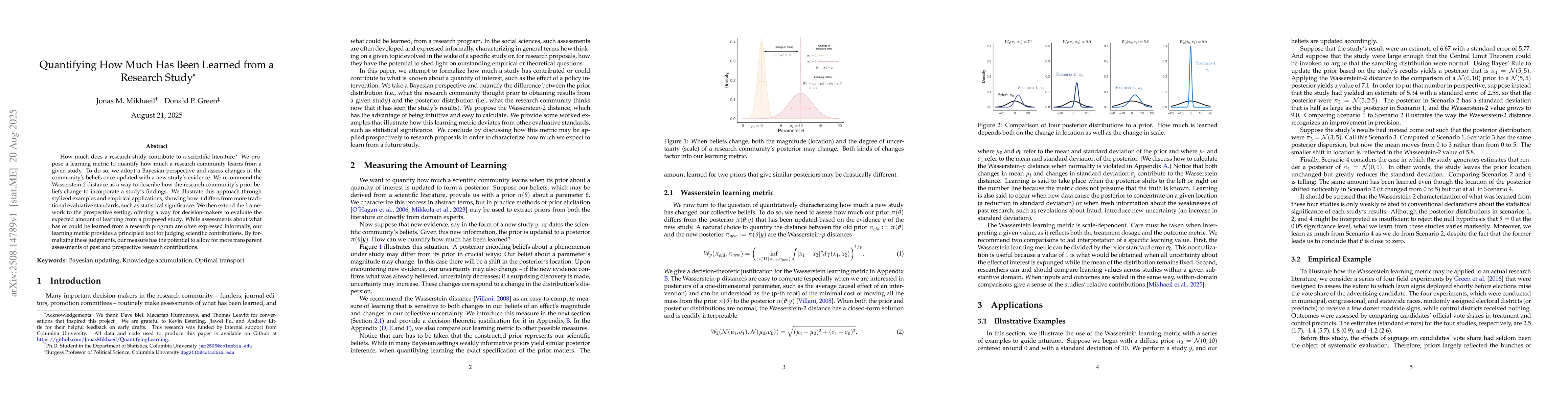 The paper proposes a learning metric based on the Wasserstein-2 distance to quantify how much a research community learns from a study, adopting a Bayesian perspective to assess changes in community beliefs upon updating with new study evidence. The approach is illustrated through examples and empirical applications, contrasting with traditional significance-based evaluations.