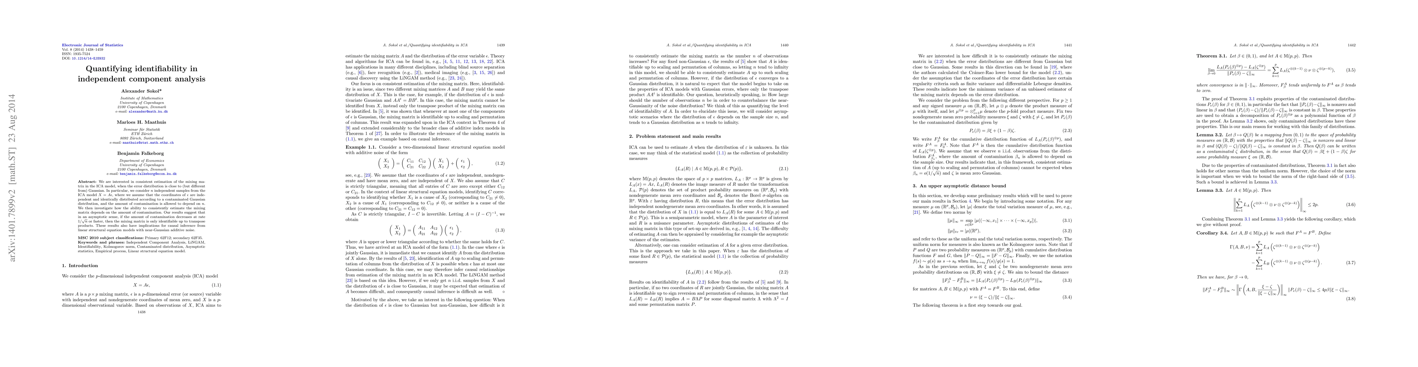This paper examines the identifiability of the mixing matrix in independent component analysis (ICA) when the error distribution is close to but not purely Gaussian. It finds that if the contamination decreases at a rate of $1/\sqrt{n}$ or faster, the mixing matrix is identifiable only up to transpose products, with implications for causal inference in linear structural equation models.