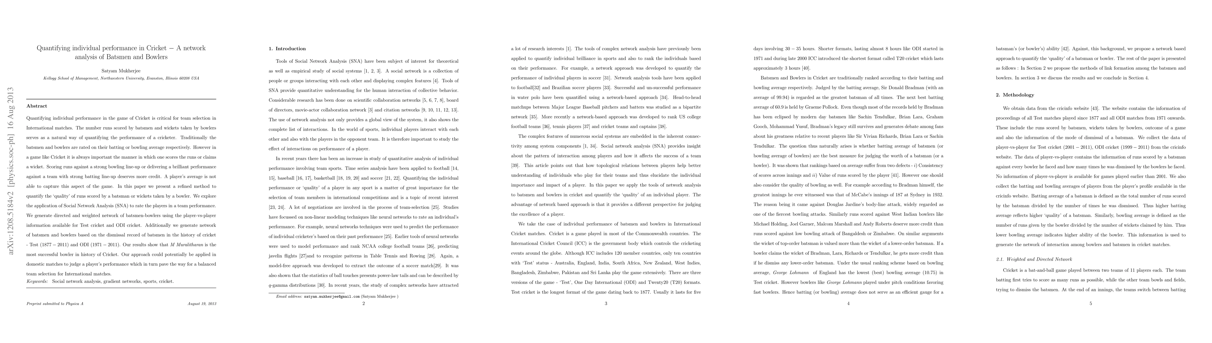 This paper proposes a refined method using Social Network Analysis to quantify the 'quality' of runs scored by batsmen and wickets taken by bowlers in Cricket, beyond traditional averages. The study generates player-vs-player and dismissal-based networks for Test and ODI cricket, revealing M Muralitharan as the most successful bowler historically.
