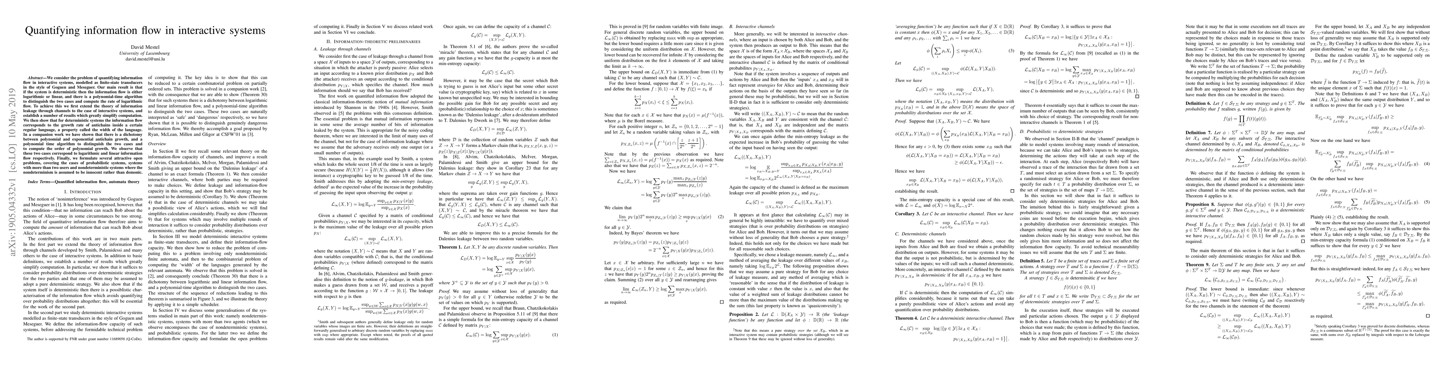 The paper extends the theory of information leakage to interactive systems, characterizing information flow in deterministic systems and providing a polynomial-time algorithm for distinguishing logarithmic from linear flow.
