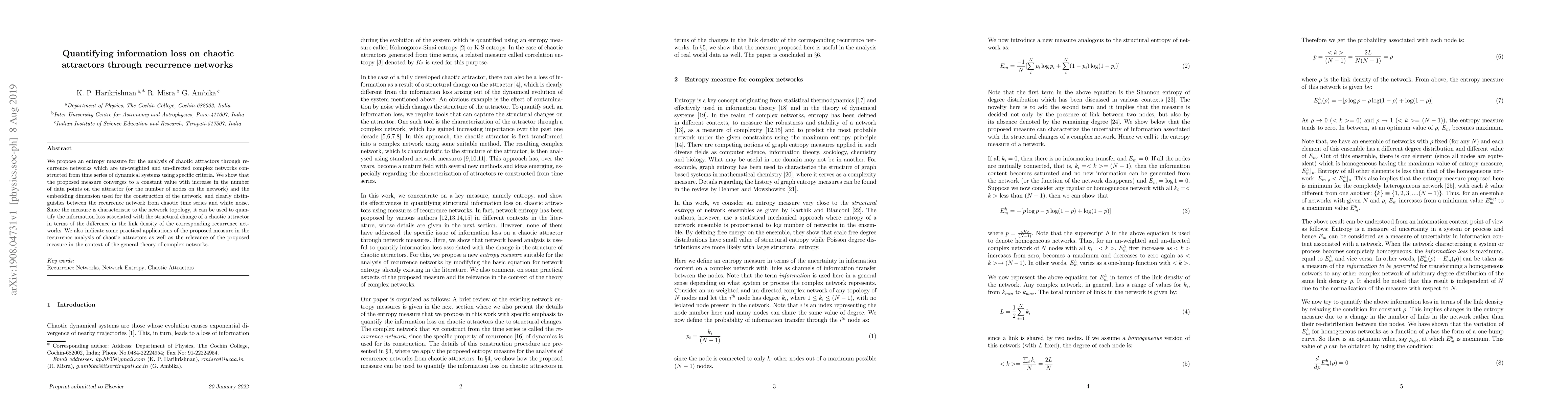 This paper introduces an entropy measure for analyzing chaotic attractors via recurrence networks, demonstrating its ability to quantify information loss by comparing network link densities. The measure distinguishes chaotic attractors from white noise and converges to a constant with more data and higher embedding dimensions.