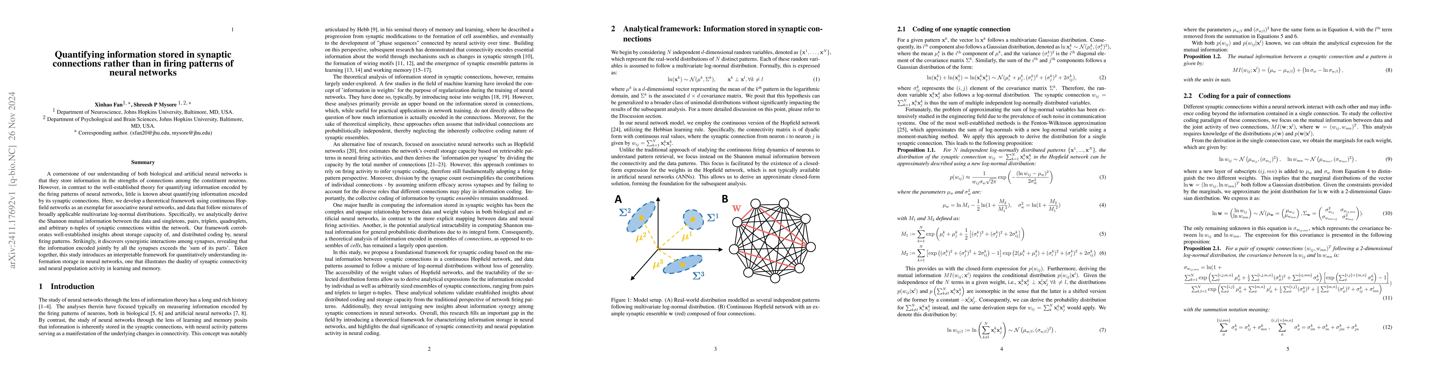 A cornerstone of our understanding of both biological and artificial neural networks is that they store information in the strengths of connections among the constituent neurons. However, in contrast to the well-established theory for quantifying information encoded by the firing patterns of neural networks, little is known about quantifying information encoded by its synaptic connections. Here, we develop a theoretical framework using continuous Hopfield networks as an exemplar for associative neural networks, and data that follow mixtures of broadly applicable multivariate log-normal distributions. Specifically, we analytically derive the Shannon mutual information between the data and singletons, pairs, triplets, quadruplets, and arbitrary n-tuples of synaptic connections within the network. Our framework corroborates well-established insights about storage capacity of, and distributed coding by, neural firing patterns. Strikingly, it discovers synergistic interactions among synapses, revealing that the information encoded jointly by all the synapses exceeds the 'sum of its parts'. Taken together, this study introduces an interpretable framework for quantitatively understanding information storage in neural networks, one that illustrates the duality of synaptic connectivity and neural population activity in learning and memory.