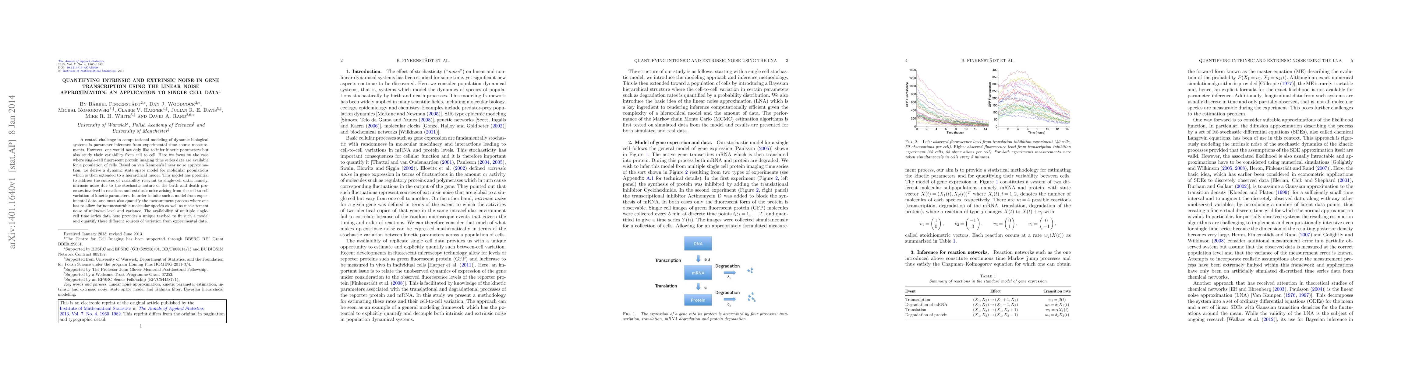 This paper develops a dynamic state space model based on the linear noise approximation to quantify intrinsic and extrinsic noise in gene transcription using single-cell data. It aims to infer kinetic parameters and their variability from experimental time series data, addressing both stochastic reaction processes and cell-to-cell parameter variations.