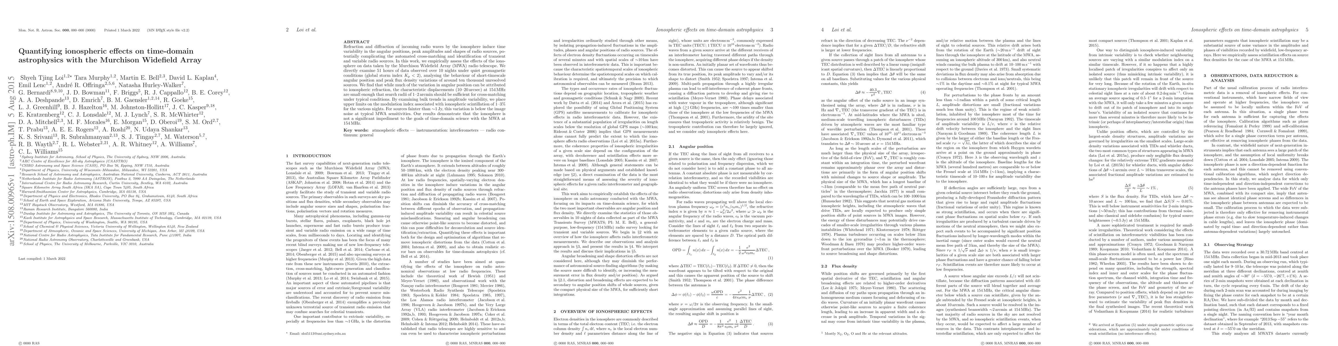 Refraction and diffraction of incoming radio waves by the ionosphere induce time variability in the angular positions, peak amplitudes and shapes of radio sources, potentially complicating the automated cross-matching and identification of transient and variable radio sources. In this work, we empirically assess the effects of the ionosphere on data taken by the Murchison Widefield Array (MWA) radio telescope. We directly examine 51 hours of data observed over 10 nights under quiet geomagnetic conditions (global storm index Kp < 2), analysing the behaviour of short-timescale angular position and peak flux density variations of around ten thousand unresolved sources. We find that while much of the variation in angular position can be attributed to ionospheric refraction, the characteristic displacements (10-20 arcsec) at 154 MHz are small enough that search radii of 1-2 arcmin should be sufficient for cross-matching under typical conditions. By examining bulk trends in amplitude variability, we place upper limits on the modulation index associated with ionospheric scintillation of 1-3% for the various nights. For sources fainter than ~1 Jy, this variation is below the image noise at typical MWA sensitivities. Our results demonstrate that the ionosphere is not a significant impediment to the goals of time-domain science with the MWA at 154 MHz.