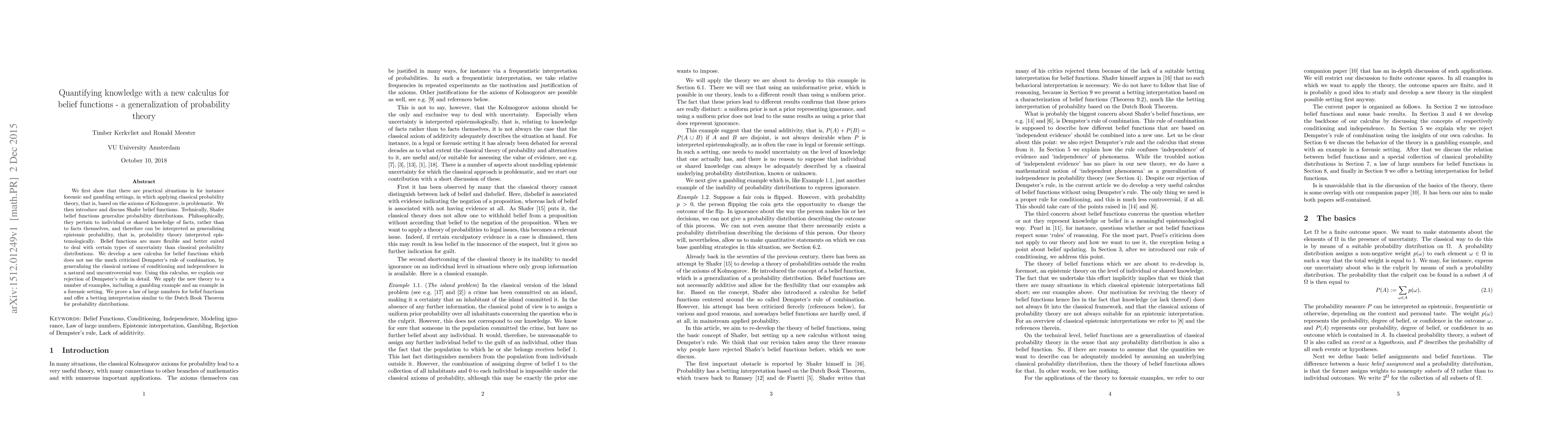 We first show that there are practical situations in for instance forensic and gambling settings, in which applying classical probability theory, that is, based on the axioms of Kolmogorov, is problematic. We then introduce and discuss Shafer belief functions. Technically, Shafer belief functions generalize probability distributions. Philosophically, they pertain to individual or shared knowledge of facts, rather than to facts themselves, and therefore can be interpreted as generalizing epistemic probability, that is, probability theory interpreted epistemologically. Belief functions are more flexible and better suited to deal with certain types of uncertainty than classical probability distributions. We develop a new calculus for belief functions which does not use the much criticized Dempster's rule of combination, by generalizing the classical notions of conditioning and independence in a natural and uncontroversial way. Using this calculus, we explain our rejection of Dempster's rule in detail. We apply the new theory to a number of examples, including a gambling example and an example in a forensic setting. We prove a law of large numbers for belief functions and offer a betting interpretation similar to the Dutch Book Theorem for probability distributions.