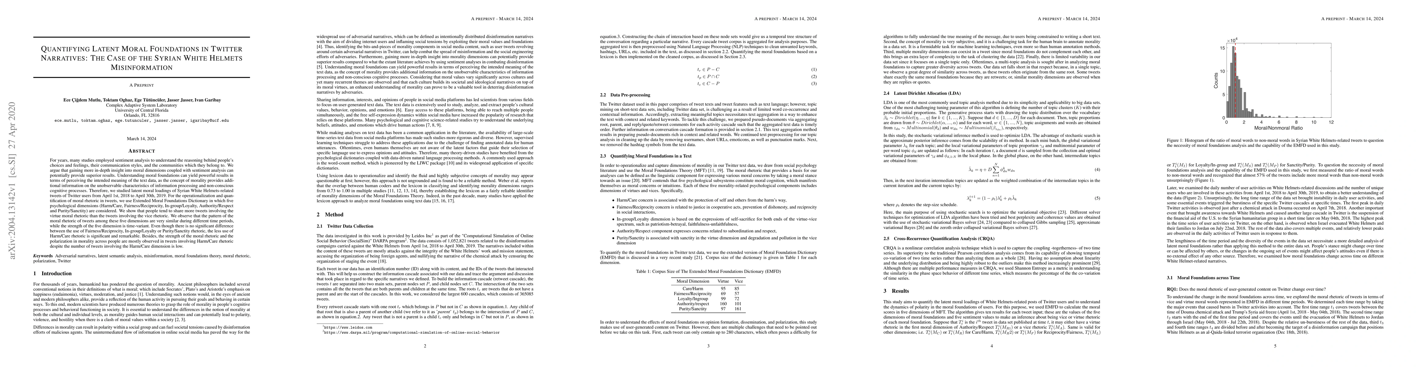 This study examines the latent moral foundations in Twitter narratives about the Syrian White Helmets, employing sentiment analysis and the Extended Moral Foundations Dictionary to quantify moral rhetoric. It finds that users share more tweets with virtue-based moral rhetoric, particularly noting a significant underuse of Harm/Care rhetoric despite its strong polarization.