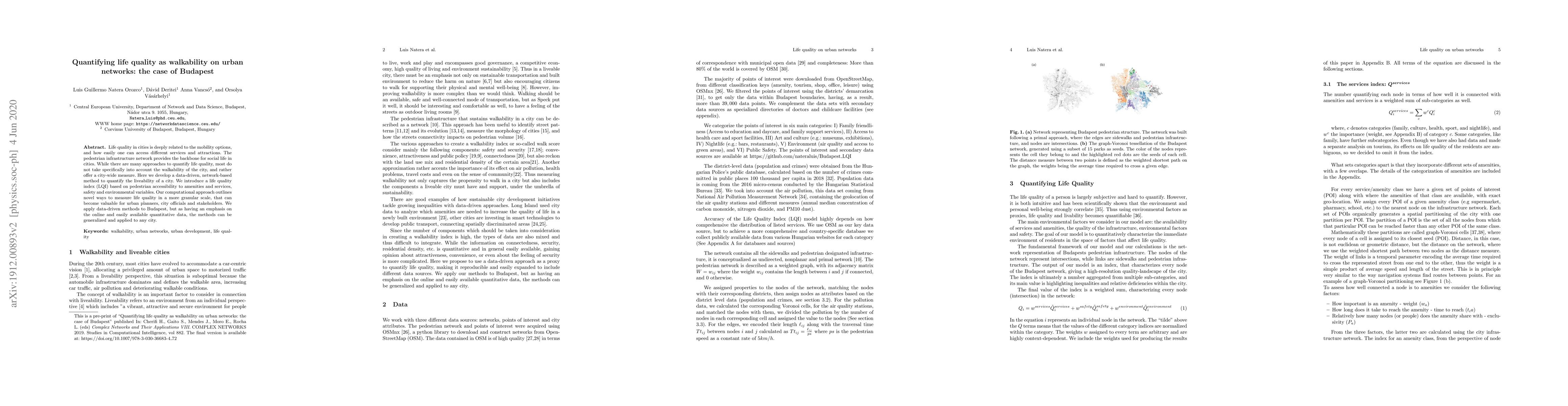 This paper develops a data-driven, network-based method to quantify urban life quality through walkability in Budapest, introducing a Life Quality Index (LQI) based on pedestrian accessibility, safety, and environmental factors. The approach offers a granular measurement tool for urban planners and can be generalized to other cities.