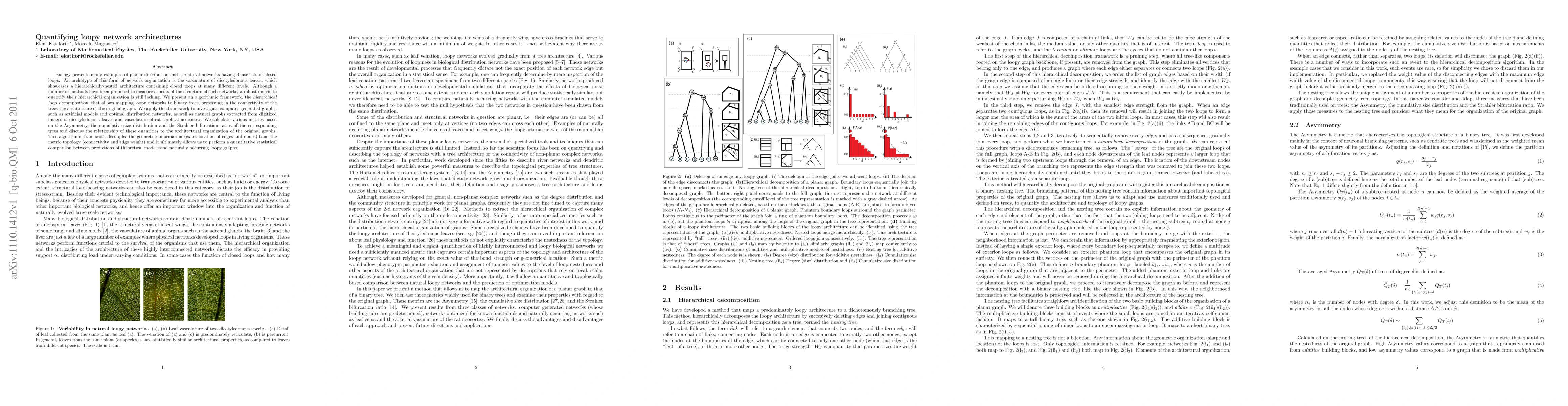 Biology presents many examples of planar distribution and structural networks having dense sets of closed loops. An archetype of this form of network organization is the vasculature of dicotyledonous leaves, which showcases a hierarchically-nested architecture containing closed loops at many different levels. Although a number of methods have been proposed to measure aspects of the structure of such networks, a robust metric to quantify their hierarchical organization is still lacking. We present an algorithmic framework, the hierarchical loop decomposition, that allows mapping loopy networks to binary trees, preserving in the connectivity of the trees the architecture of the original graph. We apply this framework to investigate computer generated graphs, such as artificial models and optimal distribution networks, as well as natural graphs extracted from digitized images of dicotyledonous leaves and vasculature of rat cerebral neocortex. We calculate various metrics based on the Asymmetry, the cumulative size distribution and the Strahler bifurcation ratios of the corresponding trees and discuss the relationship of these quantities to the architectural organization of the original graphs. This algorithmic framework decouples the geometric information (exact location of edges and nodes) from the metric topology (connectivity and edge weight) and it ultimately allows us to perform a quantitative statistical comparison between predictions of theoretical models and naturally occurring loopy graphs.