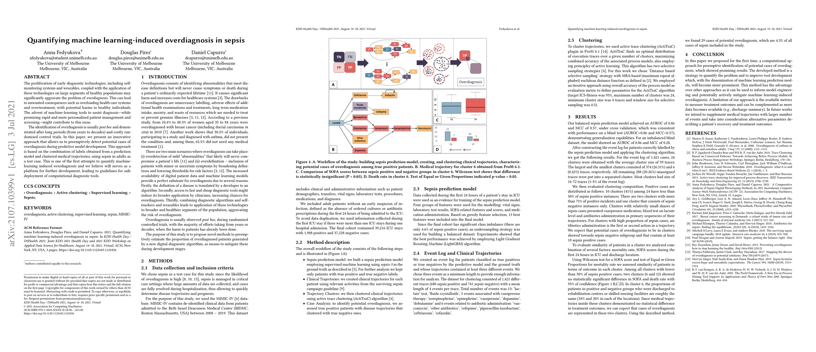 The proliferation of early diagnostic technologies, including self-monitoring systems and wearables, coupled with the application of these technologies on large segments of healthy populations may significantly aggravate the problem of overdiagnosis. This can lead to unwanted consequences such as overloading health care systems and overtreatment, with potential harms to healthy individuals. The advent of machine-learning tools to assist diagnosis -- while promising rapid and more personalised patient management and screening -- might contribute to this issue. The identification of overdiagnosis is usually post hoc and demonstrated after long periods (from years to decades) and costly randomised control trials. In this paper, we present an innovative approach that allows us to preemptively detect potential cases of overdiagnosis during predictive model development. This approach is based on the combination of labels obtained from a prediction model and clustered medical trajectories, using sepsis in adults as a test case. This is one of the first attempts to quantify machine-learning induced overdiagnosis and we believe will serves as a platform for further development, leading to guidelines for safe deployment of computational diagnostic tools.
