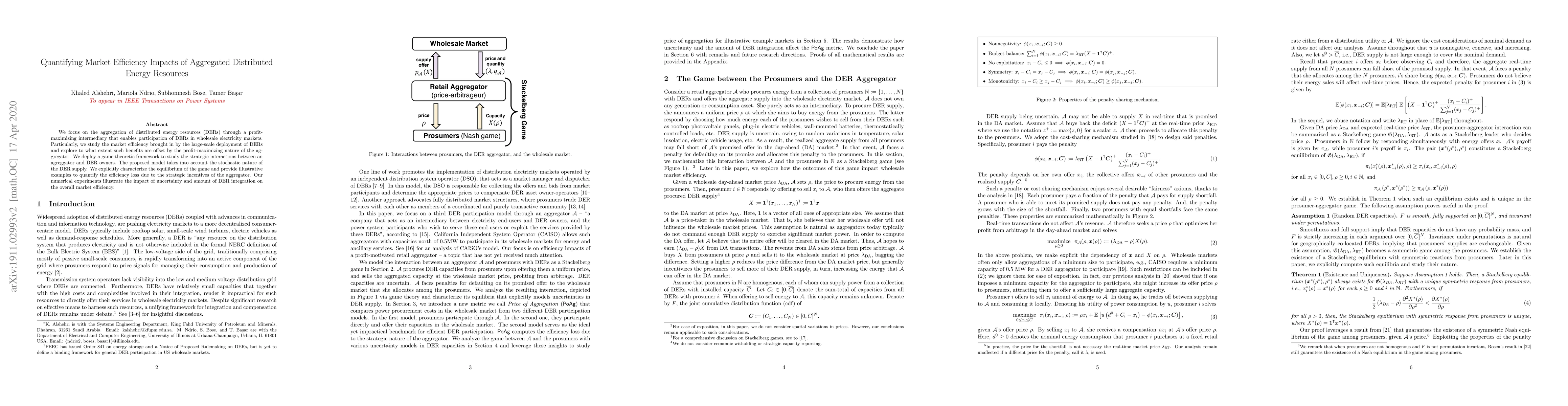 This paper uses a game-theoretic framework to analyze how aggregated distributed energy resources (DERs) impact market efficiency in wholesale electricity markets, considering the profit-maximizing behavior of aggregators. The study quantifies efficiency losses due to aggregator incentives and explores how uncertainty and DER integration affect overall market efficiency.