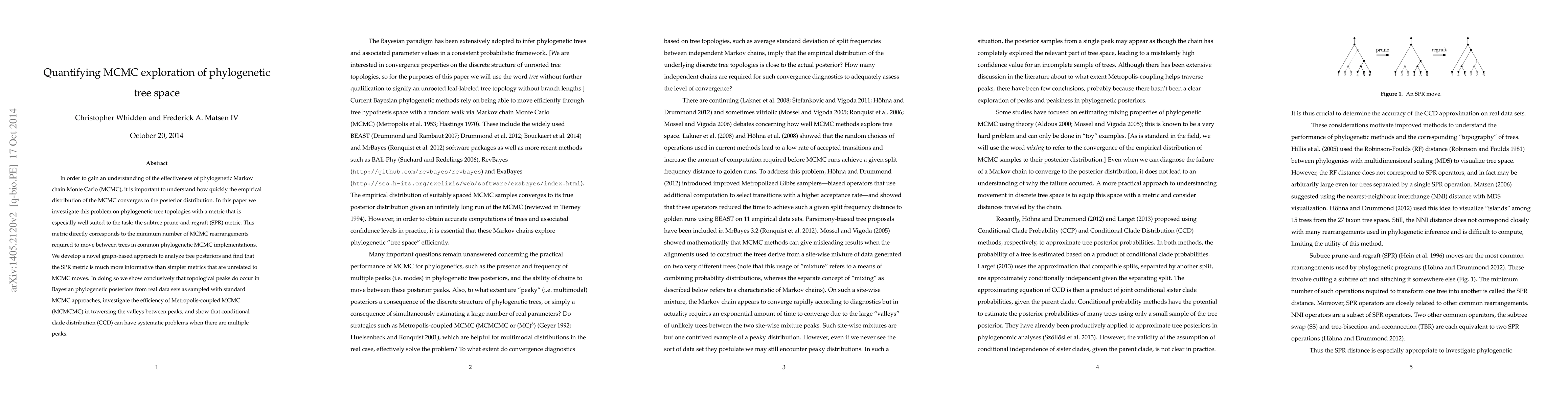 This paper explores the effectiveness of phylogenetic MCMC by analyzing convergence using the SPR metric, revealing that topological peaks exist in Bayesian phylogenetic posteriors and that MCMCMC is efficient in traversing valleys between peaks. It also highlights systematic issues with CCD in multi-peak scenarios.