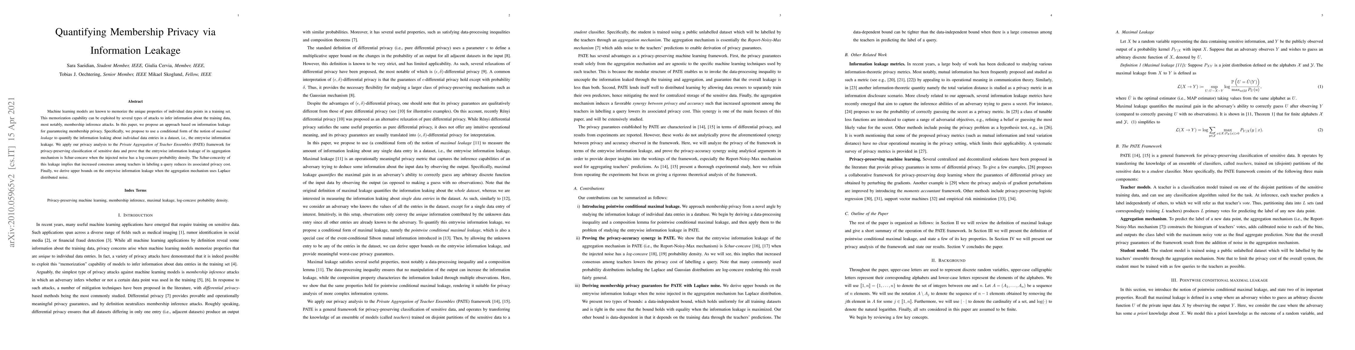 This paper proposes an information leakage-based approach to quantify membership privacy in machine learning models, specifically focusing on membership inference attacks. It introduces entrywise information leakage and applies it to the PATE framework, demonstrating that Schur-concavity of this leakage can be achieved with log-concave noise, thereby reducing privacy risks with higher teacher consensus.