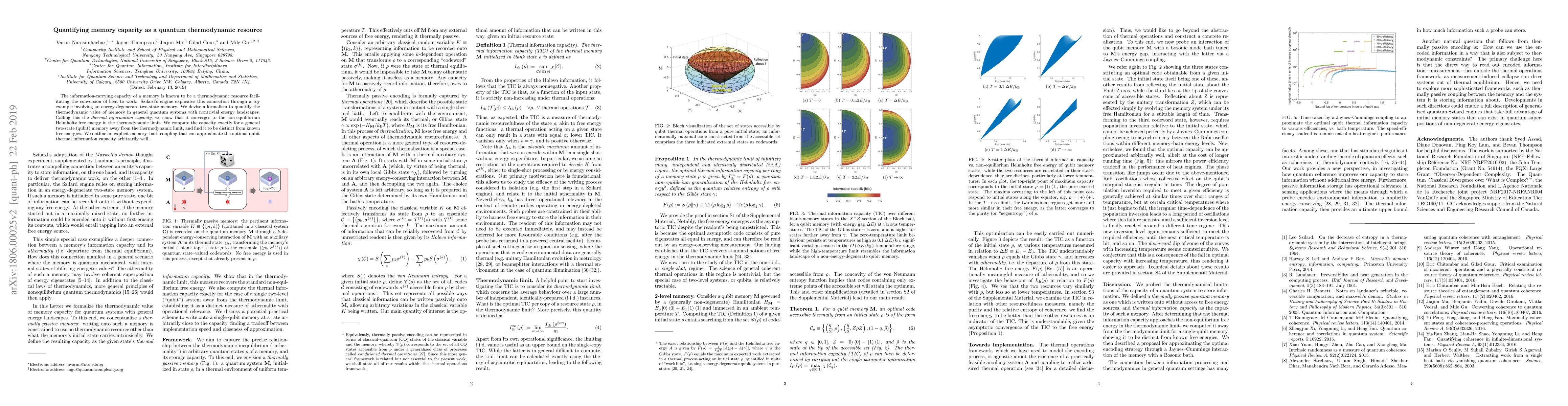 The information-carrying capacity of a memory is known to be a thermodynamic resource facilitating the conversion of heat to work. Szilard's engine explicates this connection through a toy example involving an energy-degenerate two-state memory. We devise a formalism to quantify the thermodynamic value of memory in general quantum systems with nontrivial energy landscapes. Calling this the thermal information capacity, we show that it converges to the non-equilibrium Helmholtz free energy in the thermodynamic limit. We compute the capacity exactly for a general two-state (qubit) memory away from the thermodynamic limit, and find it to be distinct from known free energies. We outline an explicit memory--bath coupling that can approximate the optimal qubit thermal information capacity arbitrarily well.
