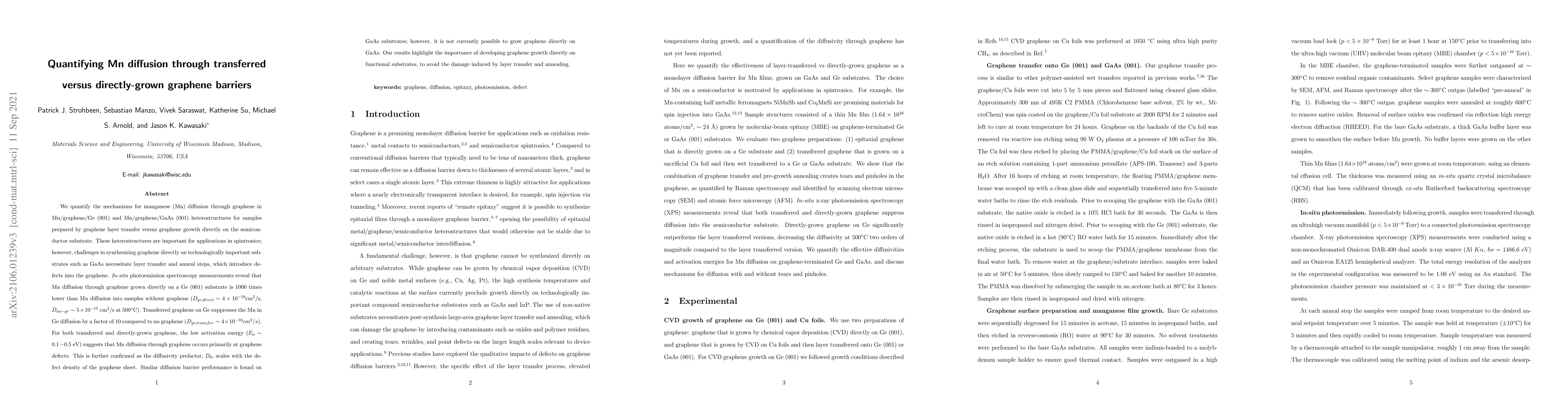 We quantify the mechanisms for manganese (Mn) diffusion through graphene in Mn/graphene/Ge (001) and Mn/graphene/GaAs (001) heterostructures for samples prepared by graphene layer transfer versus graphene growth directly on the semiconductor substrate. These heterostructures are important for applications in spintronics; however, challenges in synthesizing graphene directly on technologically important substrates such as GaAs necessitate layer transfer and anneal steps, which introduce defects into the graphene. \textit{In-situ} photoemission spectroscopy measurements reveal that Mn diffusion through graphene grown directly on a Ge (001) substrate is 1000 times lower than Mn diffusion into samples without graphene ($D_{gr,direct} \sim 4\times10^{-18}$cm$^2$/s, $D_{no-gr} \sim 5 \times 10^{-15}$ cm$^2$/s at 500$^\circ$C). Transferred graphene on Ge suppresses the Mn in Ge diffusion by a factor of 10 compared to no graphene ($D_{gr,transfer} \sim 4\times10^{-16}cm^2/s$). For both transferred and directly-grown graphene, the low activation energy ($E_a \sim 0.1-0.5$ eV) suggests that Mn diffusion through graphene occurs primarily at graphene defects. This is further confirmed as the diffusivity prefactor, $D_0$, scales with the defect density of the graphene sheet. Similar diffusion barrier performance is found on GaAs substrates; however, it is not currently possible to grow graphene directly on GaAs. Our results highlight the importance of developing graphene growth directly on functional substrates, to avoid the damage induced by layer transfer and annealing.