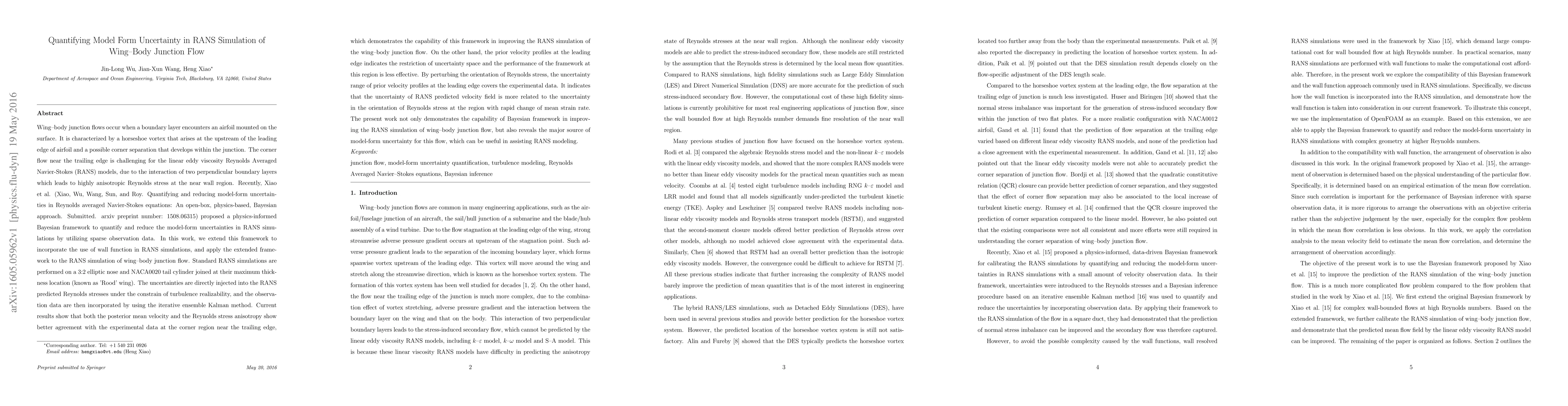 This paper extends a physics-informed Bayesian framework to quantify model-form uncertainties in RANS simulations of wing-body junction flows, showing improved agreement with experimental data near the trailing edge. It identifies the orientation of Reynolds stress as a major source of uncertainty, particularly in regions with rapid mean strain rate changes.