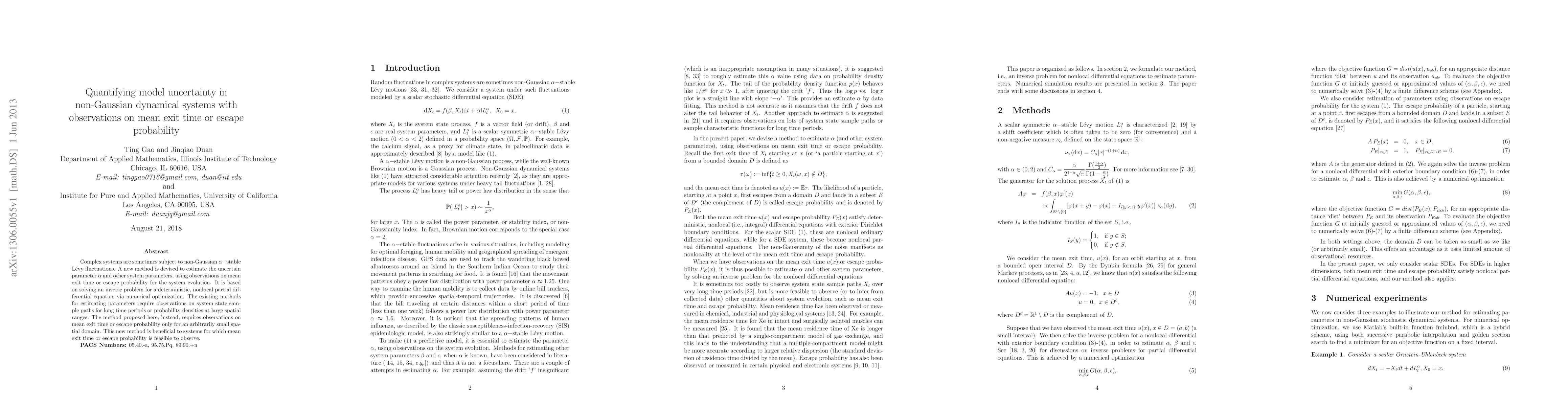 Complex systems are sometimes subject to non Gaussian alpha stable Levy fluctuations. A new method is devised to estimate this uncertain parameter and other system parameters, using observations on either mean exit time or escape probability for the system evolution. It is based on solving an inverse problem for a deterministic, non-local partial differential equation via numerical optimization. The existing methods for estimating parameters require observations on system state sample paths for long time periods or probability densities at large spatial ranges. The method proposed here, instead, requires observations on mean exit time or escape probability only for an arbitrarily small spatial domain. This new method is beneficial to systems for which mean exit time or escape probability is feasible to observe.