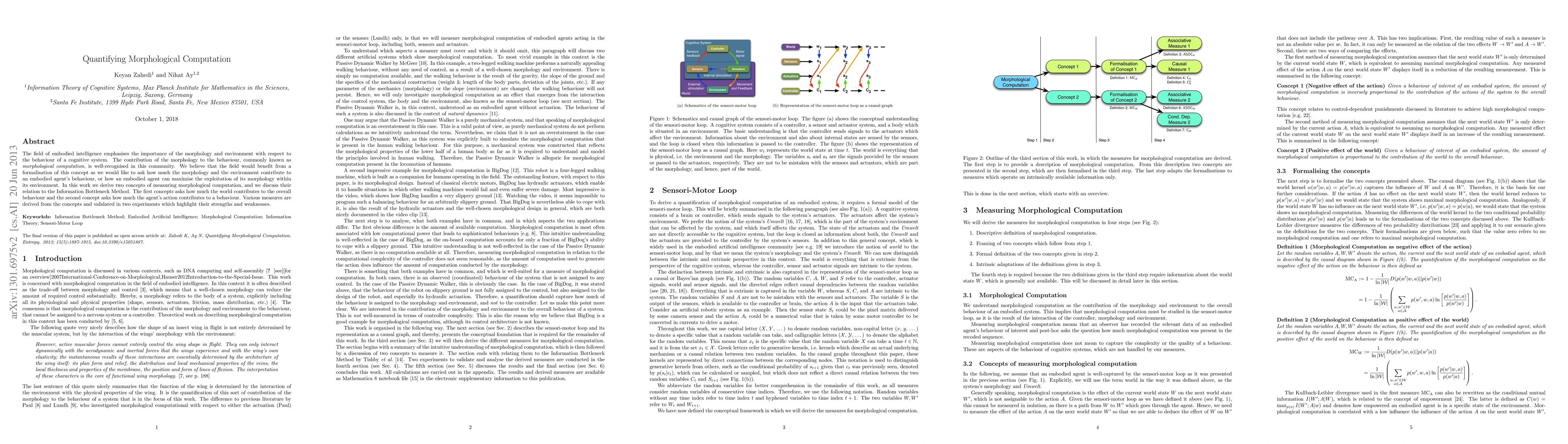 The field of embodied intelligence emphasises the importance of the morphology and environment with respect to the behaviour of a cognitive system. The contribution of the morphology to the behaviour, commonly known as morphological computation, is well-recognised in this community. We believe that the field would benefit from a formalisation of this concept as we would like to ask how much the morphology and the environment contribute to an embodied agent's behaviour, or how an embodied agent can maximise the exploitation of its morphology within its environment. In this work we derive two concepts of measuring morphological computation, and we discuss their relation to the Information Bottleneck Method. The first concepts asks how much the world contributes to the overall behaviour and the second concept asks how much the agent's action contributes to a behaviour. Various measures are derived from the concepts and validated in two experiments which highlight their strengths and weaknesses.