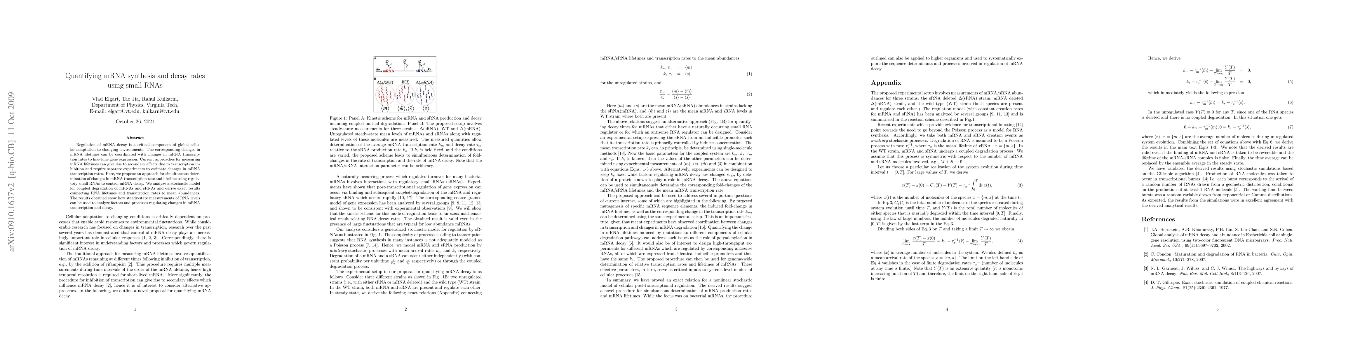 This paper proposes a novel method to simultaneously measure mRNA transcription rates and decay rates using regulatory small RNAs. The study develops a stochastic model to connect RNA lifetimes and transcription rates to RNA abundances, enabling analysis of cellular adaptation mechanisms through steady-state RNA level measurements.