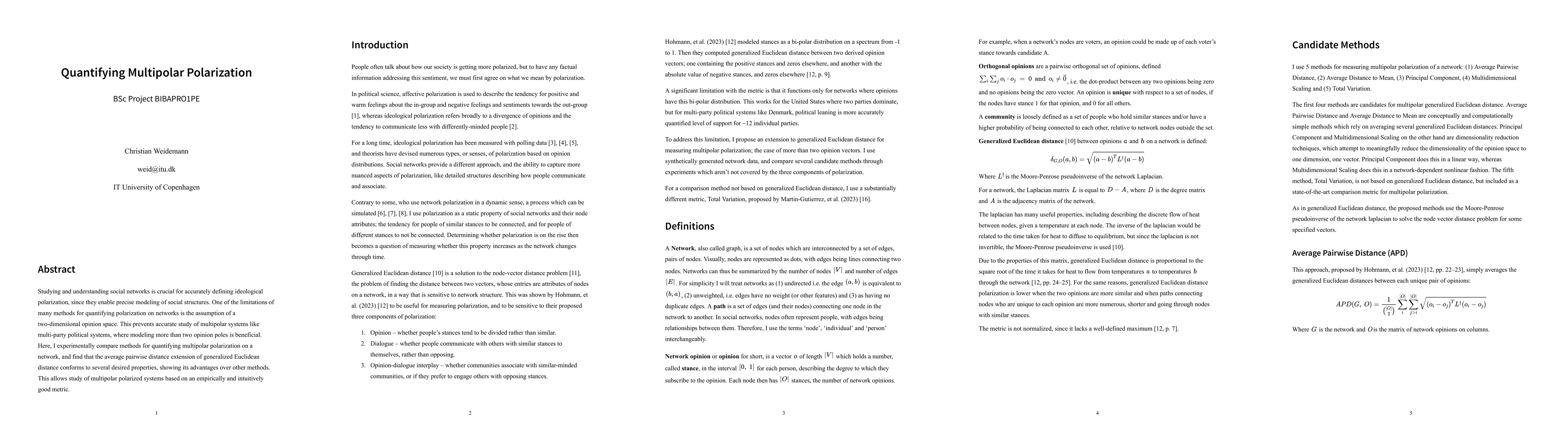 This paper investigates methods for quantifying multipolar polarization in social networks, demonstrating that the average pairwise distance extension of generalized Euclidean distance offers advantages over other methods by accommodating multi-opinion poles, thus providing a more accurate metric for multipolar systems like multi-party political structures.