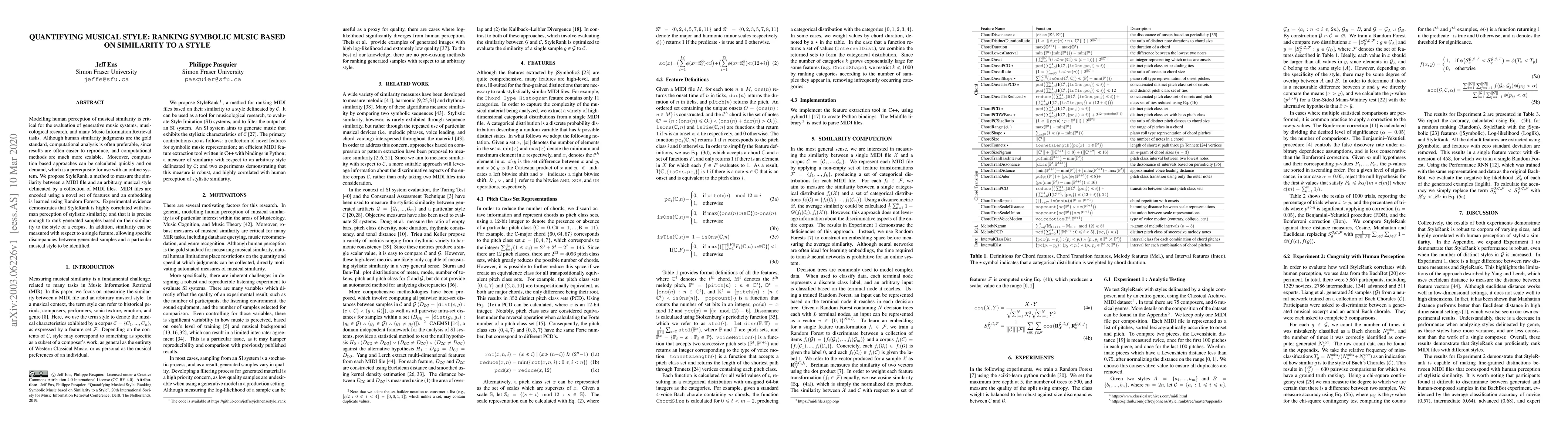 The paper proposes StyleRank, a computational method to quantify musical style similarity using MIDI files encoded with novel features and Random Forest embeddings. Experimental results show that StyleRank correlates well with human judgments and can precisely rank generated music based on stylistic similarity, facilitating scalable and on-demand analysis.