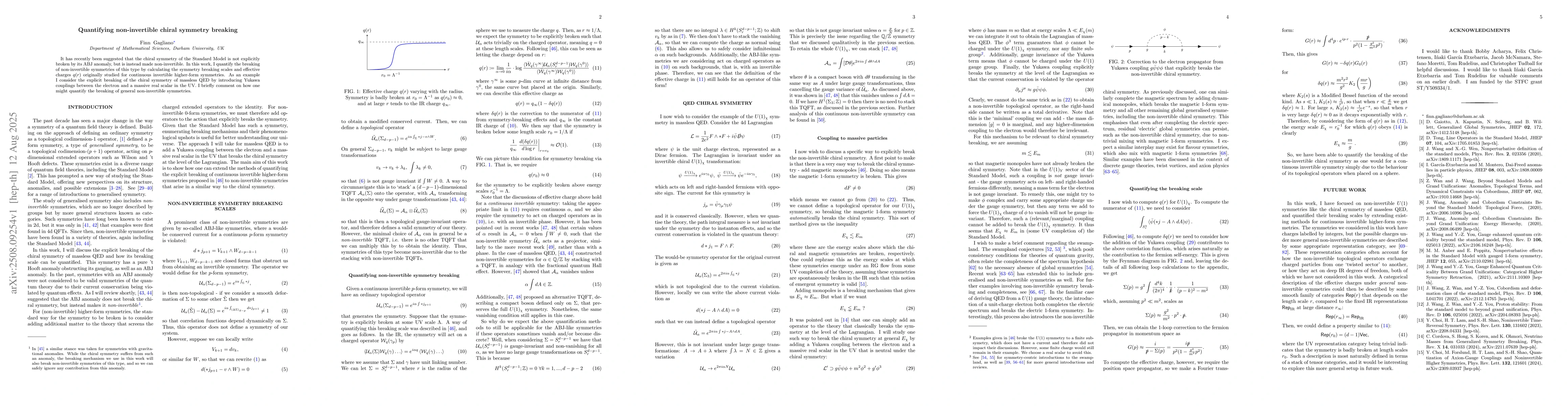 The research quantifies the breaking of non-invertible chiral symmetry in massless QED by calculating symmetry breaking scales and effective charges using Yukawa coupling between electrons and a massive scalar field.