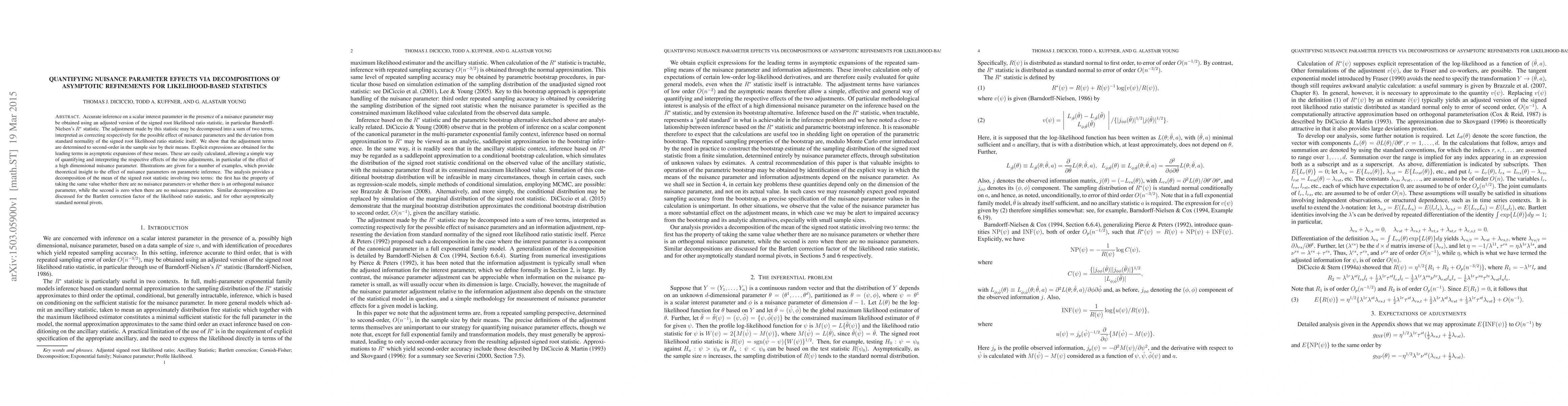 Accurate inference on a scalar interest parameter in the presence of a nuisance parameter may be obtained using an adjusted version of the signed root likelihood ratio statistic, in particular Barndorff-Nielsen's $R^*$ statistic. The adjustment made by this statistic may be decomposed into a sum of two terms, interpreted as correcting respectively for the possible effect of nuisance parameters and the deviation from standard normality of the signed root likelihood ratio statistic itself. We show that the adjustment terms are determined to second-order in the sample size by their means. Explicit expressions are obtained for the leading terms in asymptotic expansions of these means. These are easily calculated, allowing a simple way of quantifying and interpreting the respective effects of the two adjustments, in particular of the effect of a high dimensional nuisance parameter. Illustrations are given for a number of examples, which provide theoretical insight to the effect of nuisance parameters on parametric inference. The analysis provides a decomposition of the mean of the signed root statistic involving two terms: the first has the property of taking the same value whether there are no nuisance parameters or whether there is an orthogonal nuisance parameter, while the second is zero when there are no nuisance parameters. Similar decompositions are discussed for the Bartlett correction factor of the likelihood ratio statistic, and for other asymptotically standard normal pivots.
