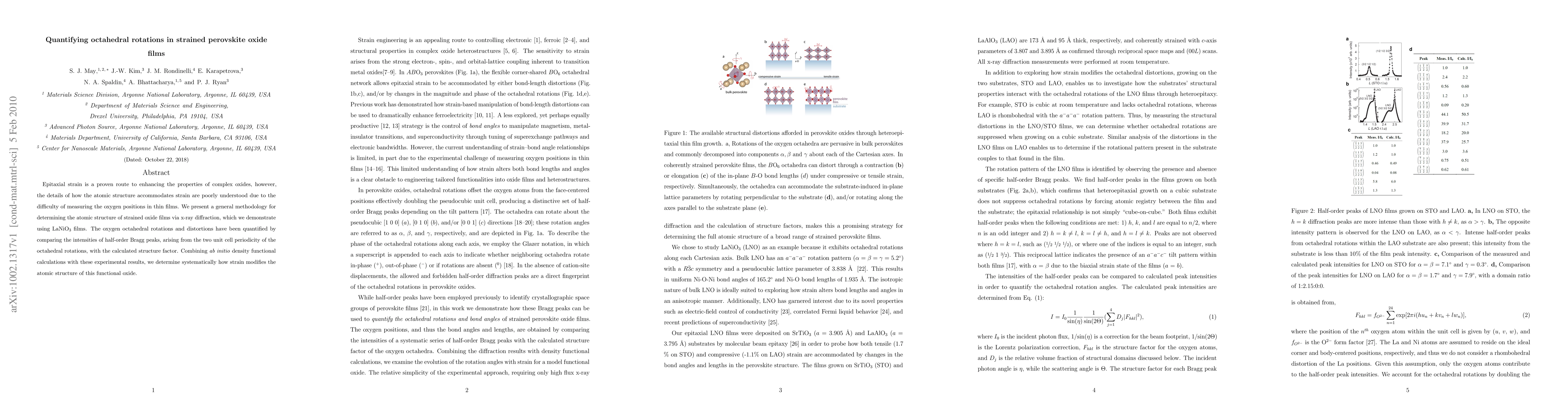 This paper presents a methodology for determining the atomic structure of strained perovskite oxide films using x-ray diffraction, quantifying octahedral rotations and distortions in LaNiO3 films through half-order Bragg peak intensities. The study combines experimental results with ab initio calculations to understand how strain modifies the atomic structure of functional oxides.