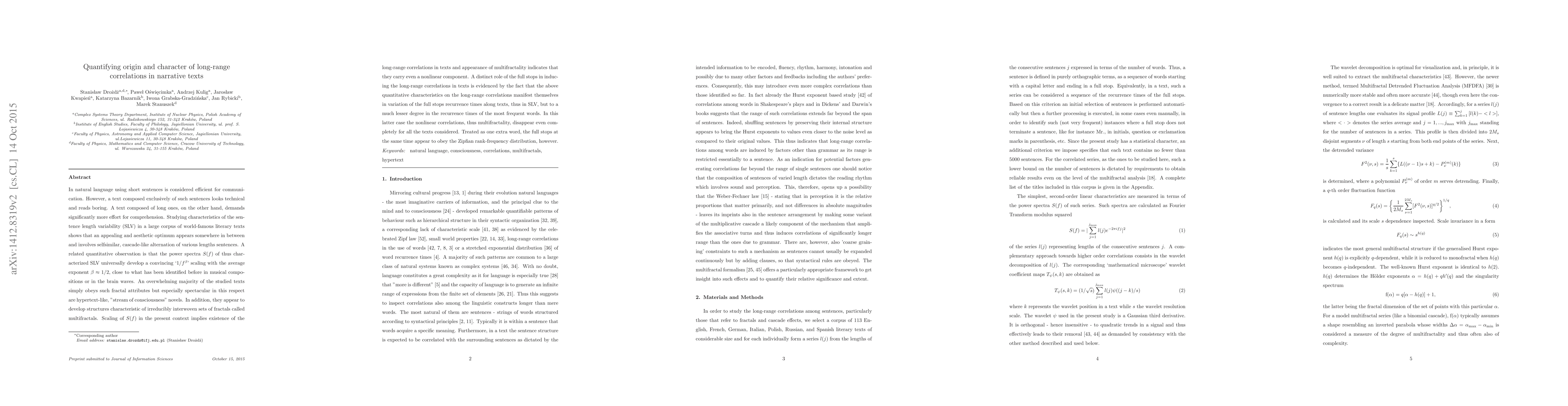 Research paper explores how long-range correlations in narrative texts follow a 1/f^beta scaling, similar to musical compositions and brain waves, with an average exponent beta of approximately 1/2. The study finds that full stops induce long-range correlations, while most frequent words do not exhibit nonlinear behavior.