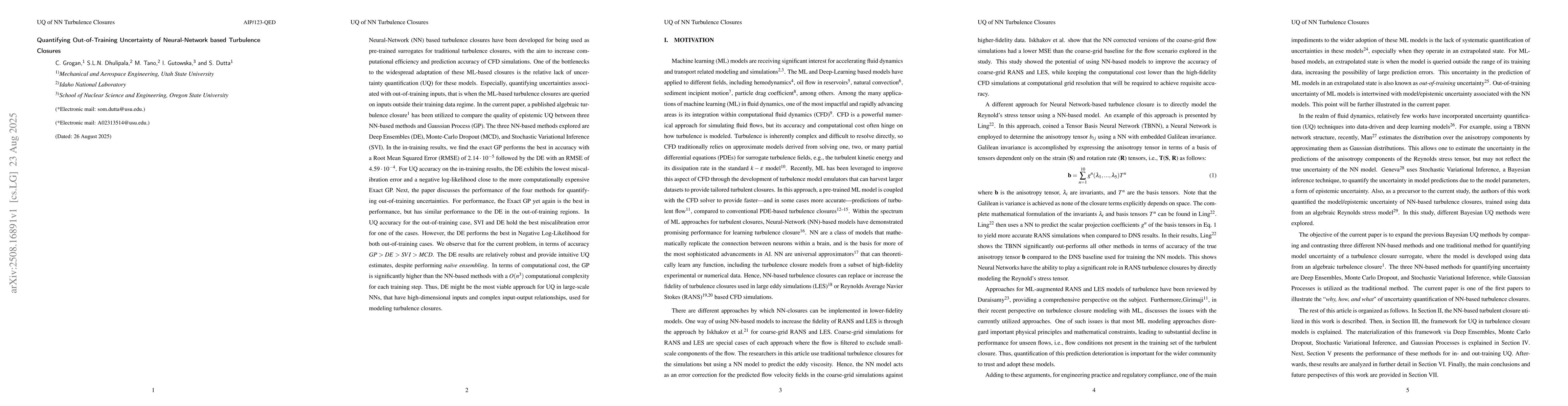 Neural-Network (NN) based turbulence closures have been developed for being used as pre-trained surrogates for traditional turbulence closures, with the aim to increase computational efficiency and prediction accuracy of CFD simulations. The bottleneck to the widespread adaptation of these ML-based closures is the relative lack of uncertainty quantification (UQ) for these models. Especially, quantifying uncertainties associated with out-of-training inputs, that is when the ML-based turbulence closures are queried on inputs outside their training data regime. In the current paper, a published algebraic turbulence closure1 has been utilized to compare the quality of epistemic UQ between three NN-based methods and Gaussian Process (GP). The three NN-based methods explored are Deep Ensembles (DE), Monte-Carlo Dropout (MCD), and Stochastic Variational Inference (SVI). In the in-training results, we find the exact GP performs the best in accuracy with a Root Mean Squared Error (RMSE) of $2.14 \cdot 10^{-5}$ followed by the DE with an RMSE of $4.59 \cdot 10^{-4}$. Next, the paper discusses the performance of the four methods for quantifying out-of-training uncertainties. For performance, the Exact GP yet again is the best in performance, but has similar performance to the DE in the out-of-training regions. In UQ accuracy for the out-of-training case, SVI and DE hold the best miscalibration error for one of the cases. However, the DE performs the best in Negative Log-Likelihood for both out-of-training cases. We observe that for the current problem, in terms of accuracy GP > DE > SV I > MCD. The DE results are relatively robust and provide intuitive UQ estimates, despite performing naive ensembling. In terms of computational cost, the GP is significantly higher than the NN-based methods with a $O(n^3)$ computational complexity for each training step