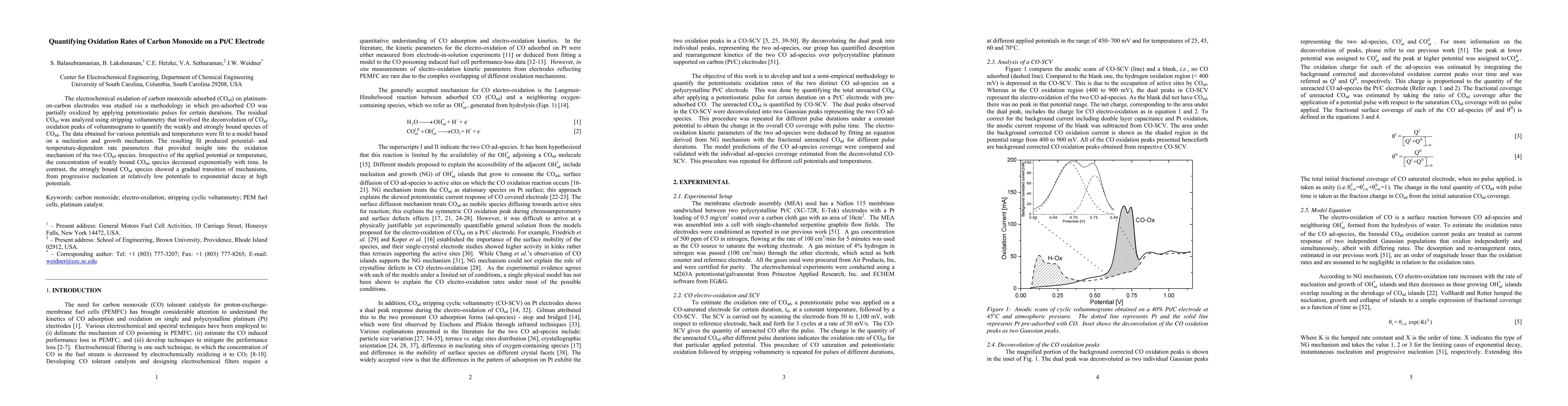 The electrochemical oxidation of carbon monoxide adsorbed (COad) on platinum-on-carbon electrodes was studied via a methodology in which pre-adsorbed CO was partially oxidized by applying potentiostatic pulses for certain durations. The residual COad was analyzed using stripping voltammetry that involved the deconvolution of COad oxidation peaks of voltammograms to quantify the weakly and strongly bound species of COad. The data obtained for various potentials and temperatures were fit to a model based on a nucleation and growth mechanism. The resulting fit produced potential- and temperature-dependent rate parameters that provided insight into the oxidation mechanism of the two COad species. Irrespective of the applied potential or temperature, the concentration of weakly bound COad species decreased exponentially with time. In contrast, the strongly bound COad species showed a gradual transition of mechanisms, from progressive nucleation at relatively low potentials to exponential decay at high potentials.