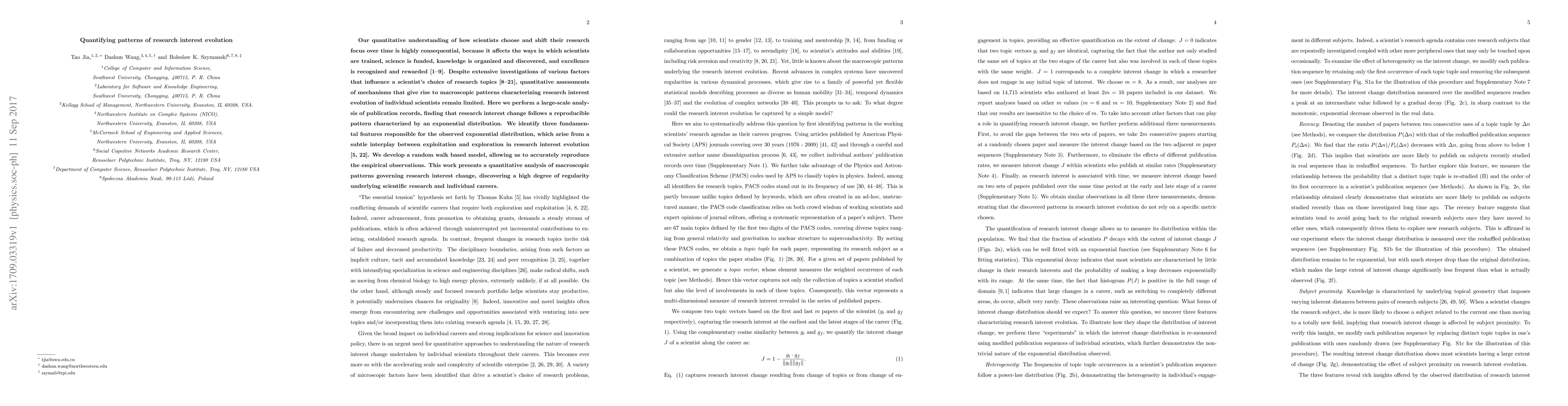 A large-scale analysis of publication records found that research interest change follows an exponential distribution, driven by a balance between exploitation and exploration. This study identifies a reproducible pattern underlying scientific research and individual careers.
