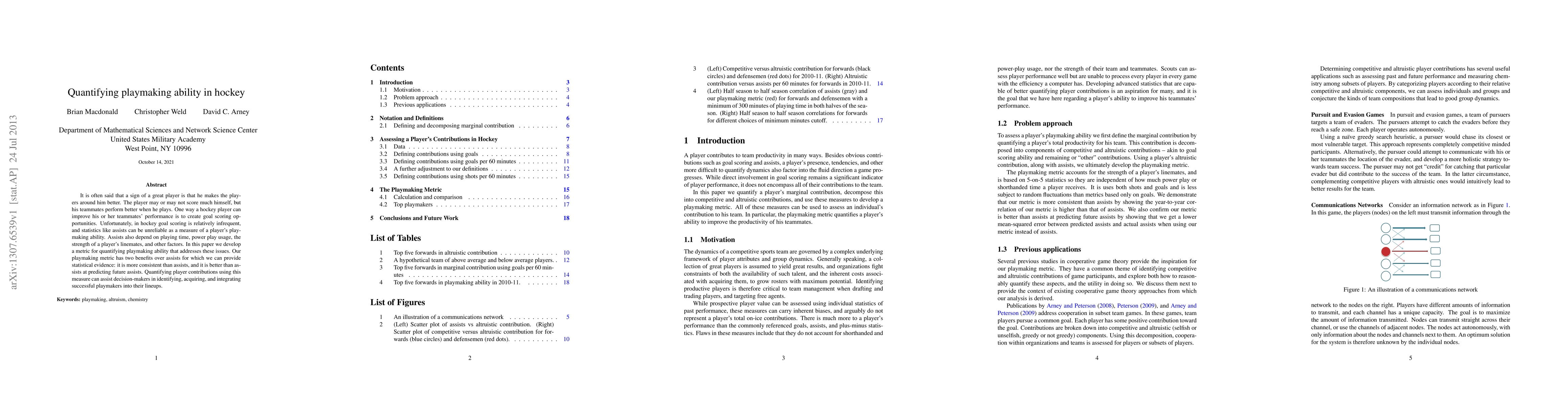 It is often said that a sign of a great player is that he makes the players around him better. The player may or may not score much himself, but his teammates perform better when he plays. One way a hockey player can improve his or her teammates' performance is to create goal scoring opportunities. Unfortunately, in hockey goal scoring is relatively infrequent, and statistics like assists can be unreliable as a measure of a player's playmaking ability. Assists also depend on playing time, power play usage, the strength of a player's linemates, and other factors. In this paper we develop a metric for quantifying playmaking ability that addresses these issues. Our playmaking metric has two benefits over assists for which we can provide statistical evidence: it is more consistent than assists, and it is better than assists at predicting future assists. Quantifying player contributions using this measure can assist decision-makers in identifying, acquiring, and integrating successful playmakers into their lineups.