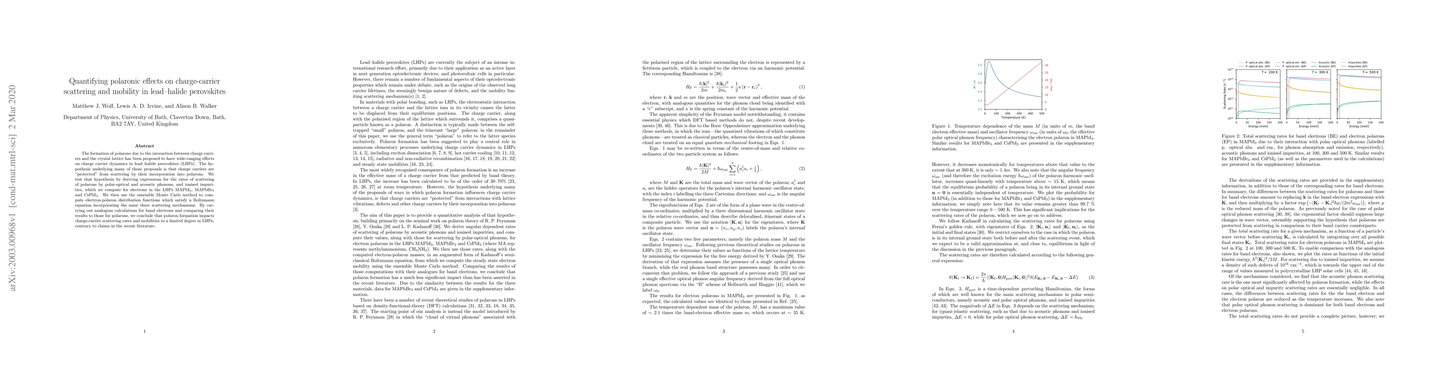 The formation of polarons due to the interaction between charge carriers and the crystal lattice has been proposed to have wide-ranging effects on charge carrier dynamics in lead--halide perovskites (LHPs). The hypothesis underlying many of those proposals is that charge carriers are "protected" from scattering by their incorporation into polarons. We test that hypothesis by deriving expressions for the rates of scattering of polarons by polar-optical and acoustic phonons, and ionised impurities, which we compute for electrons in the LHPs MAPbI$_{3}$ , MAPbBr$_{3}$ and CsPbI$_{3}$. We then use the ensemble Monte Carlo method to compute electron-polaron distribution functions which satisfy a Boltzmann equation incorporating the same three scattering mechanisms. By carrying out analogous calculations for band electrons and comparing their results to those for polarons, we conclude that polaron formation impacts charge-carrier scattering rates and mobilities to a limited degree in LHPs, contrary to claims in the recent literature.
