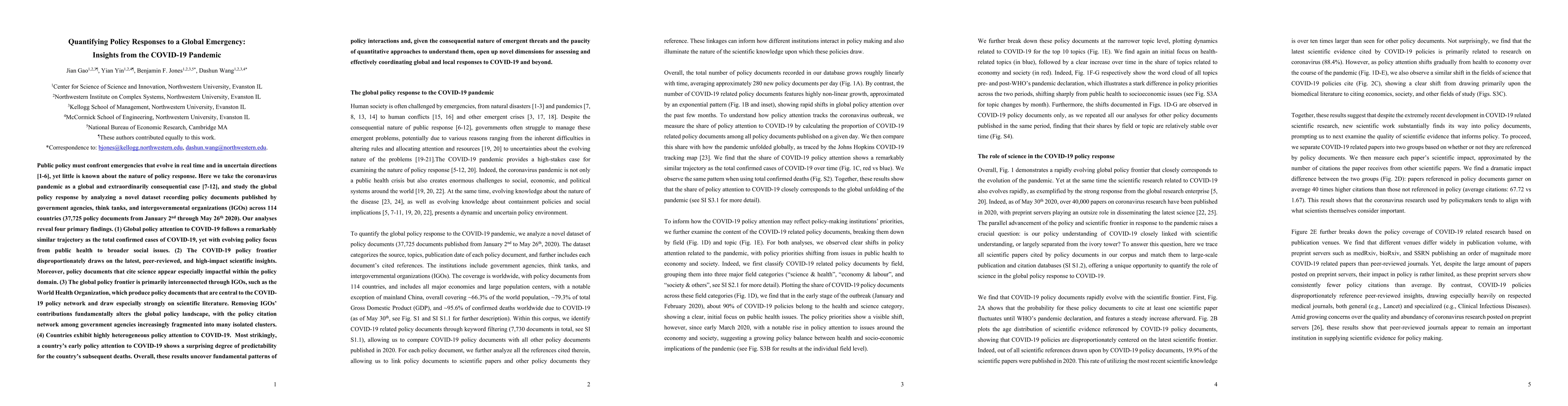 Public policy must confront emergencies that evolve in real time and in uncertain directions, yet little is known about the nature of policy response. Here we take the coronavirus pandemic as a global and extraordinarily consequential case, and study the global policy response by analyzing a novel dataset recording policy documents published by government agencies, think tanks, and intergovernmental organizations (IGOs) across 114 countries (37,725 policy documents from Jan 2nd through May 26th 2020). Our analyses reveal four primary findings. (1) Global policy attention to COVID-19 follows a remarkably similar trajectory as the total confirmed cases of COVID-19, yet with evolving policy focus from public health to broader social issues. (2) The COVID-19 policy frontier disproportionately draws on the latest, peer-reviewed, and high-impact scientific insights. Moreover, policy documents that cite science appear especially impactful within the policy domain. (3) The global policy frontier is primarily interconnected through IGOs, such as the WHO, which produce policy documents that are central to the COVID19 policy network and draw especially strongly on scientific literature. Removing IGOs' contributions fundamentally alters the global policy landscape, with the policy citation network among government agencies increasingly fragmented into many isolated clusters. (4) Countries exhibit highly heterogeneous policy attention to COVID-19. Most strikingly, a country's early policy attention to COVID-19 shows a surprising degree of predictability for the country's subsequent deaths. Overall, these results uncover fundamental patterns of policy interactions and, given the consequential nature of emergent threats and the paucity of quantitative approaches to understand them, open up novel dimensions for assessing and effectively coordinating global and local responses to COVID-19 and beyond.