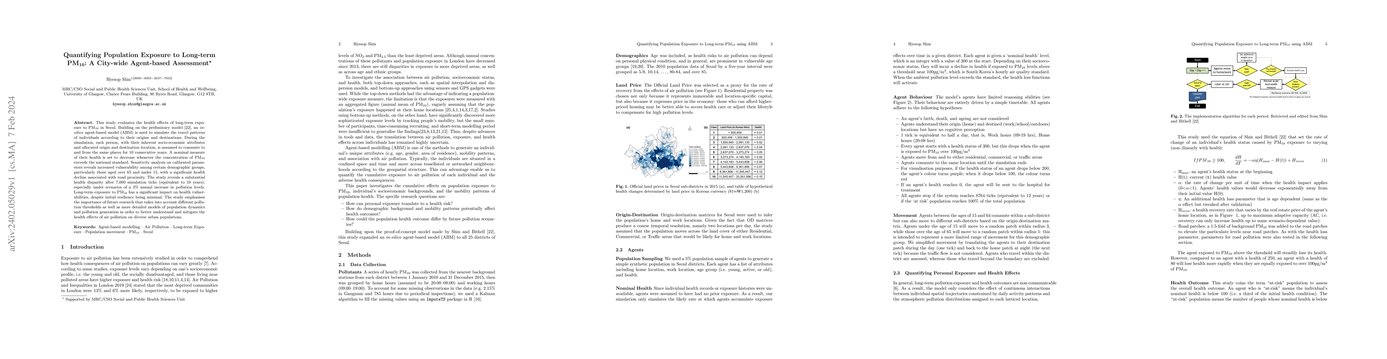 This study uses an agent-based model to simulate long-term PM10 exposure in Seoul, finding significant health disparities among vulnerable groups, especially the elderly and children, with proximity to roads exacerbating health decline. Future research should consider varied pollution thresholds and more detailed population dynamics.