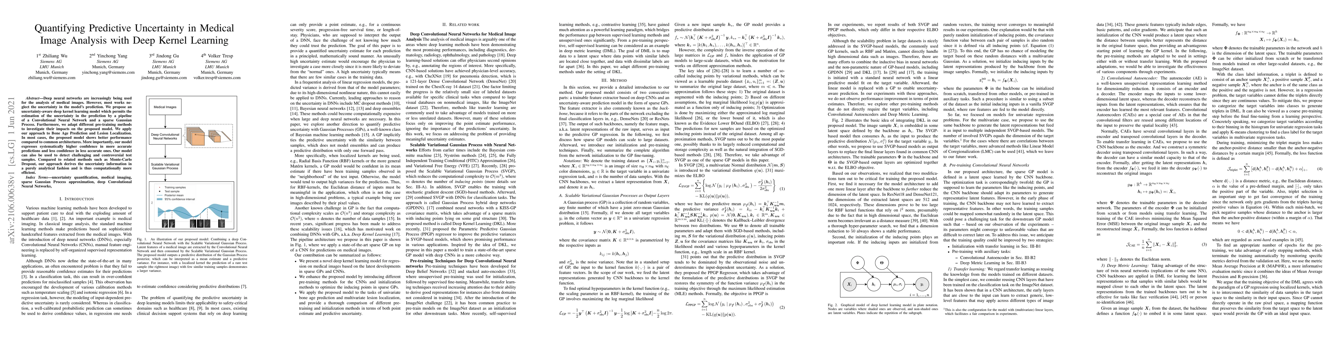 Deep neural networks are increasingly being used for the analysis of medical images. However, most works neglect the uncertainty in the model's prediction. We propose an uncertainty-aware deep kernel learning model which permits the estimation of the uncertainty in the prediction by a pipeline of a Convolutional Neural Network and a sparse Gaussian Process. Furthermore, we adapt different pre-training methods to investigate their impacts on the proposed model. We apply our approach to Bone Age Prediction and Lesion Localization. In most cases, the proposed model shows better performance compared to common architectures. More importantly, our model expresses systematically higher confidence in more accurate predictions and less confidence in less accurate ones. Our model can also be used to detect challenging and controversial test samples. Compared to related methods such as Monte-Carlo Dropout, our approach derives the uncertainty information in a purely analytical fashion and is thus computationally more efficient.
