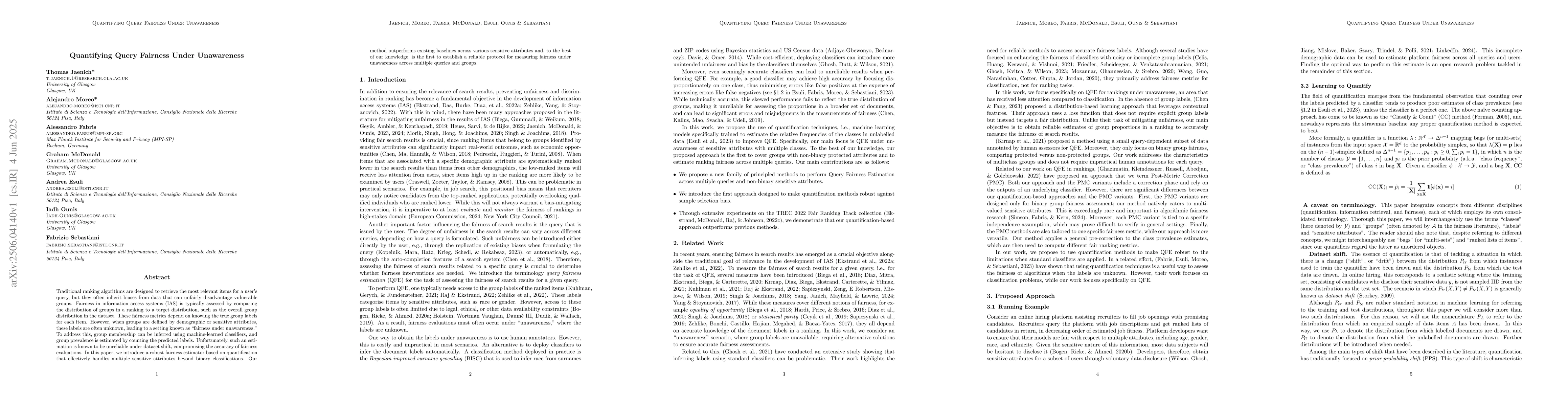 A new fairness estimator measures query fairness under unawareness by quantifying group membership and prevalence across multiple sensitive attributes, outperforming existing baselines.