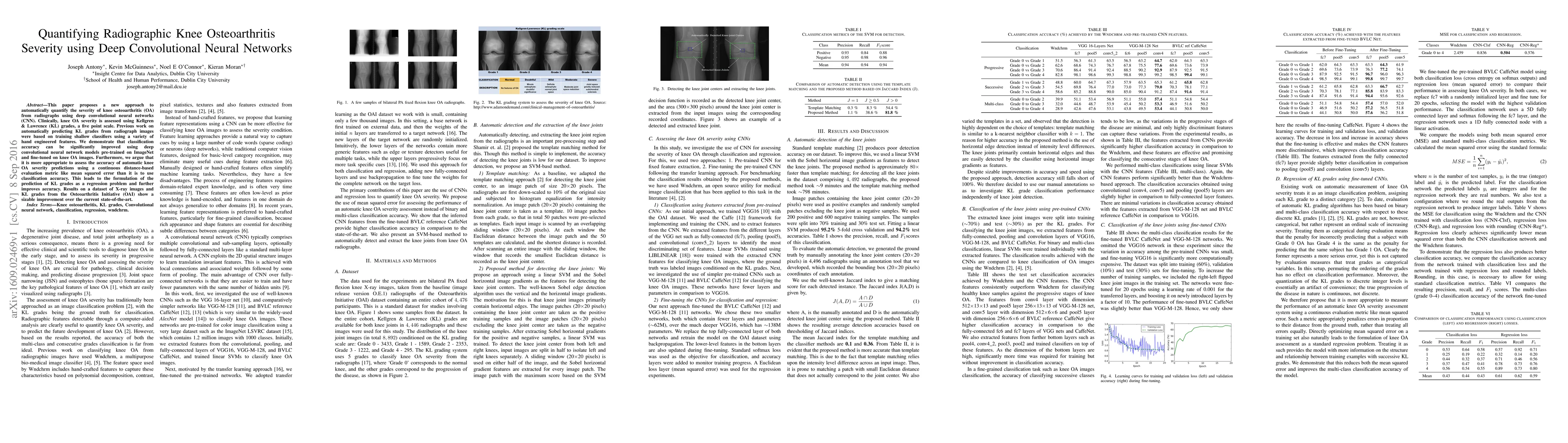 This paper introduces a deep convolutional neural network approach to automatically quantify the severity of knee osteoarthritis from radiographs, improving upon previous shallow classifiers. It proposes assessing accuracy via regression rather than classification, leading to better performance on the Osteoarthritis Initiative dataset.