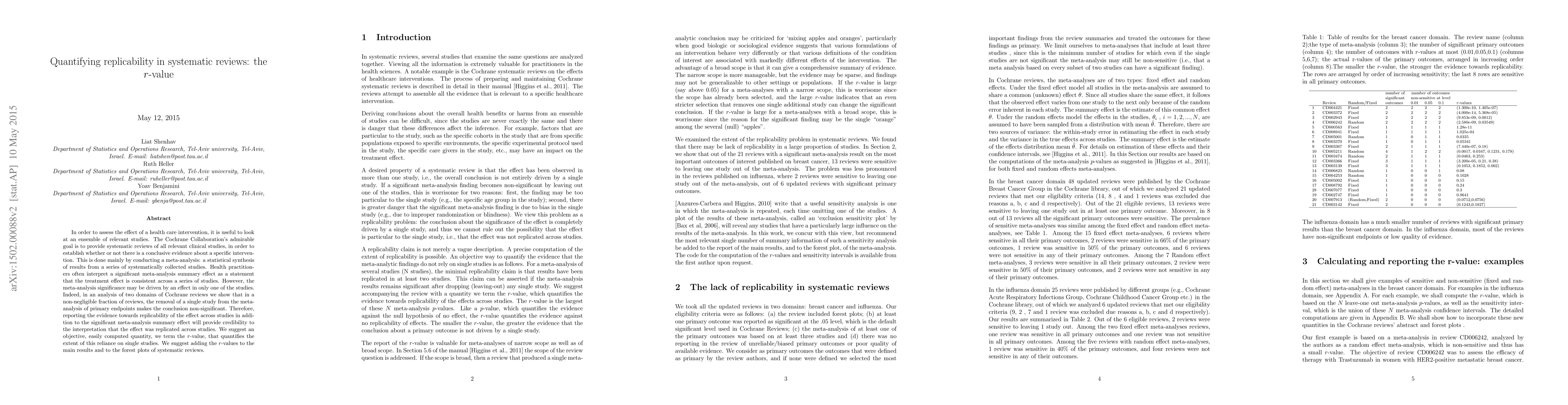 In order to assess the effect of a health care intervention, it is useful to look at an ensemble of relevant studies. The Cochrane Collaboration's admirable goal is to provide systematic reviews of all relevant clinical studies, in order to establish whether or not there is a conclusive evidence about a specific intervention. This is done mainly by conducting a meta-analysis: a statistical synthesis of results from a series of systematically collected studies. Health practitioners often interpret a significant meta-analysis summary effect as a statement that the treatment effect is consistent across a series of studies. However, the meta-analysis significance may be driven by an effect in only one of the studies. Indeed, in an analysis of two domains of Cochrane reviews we show that in a non-negligible fraction of reviews, the removal of a single study from the meta-analysis of primary endpoints makes the conclusion non-significant. Therefore, reporting the evidence towards replicability of the effect across studies in addition to the significant meta-analysis summary effect will provide credibility to the interpretation that the effect was replicated across studies. We suggest an objective, easily computed quantity, we term the r-value, that quantifies the extent of this reliance on single studies. We suggest adding the r-values to the main results and to the forest plots of systematic reviews.