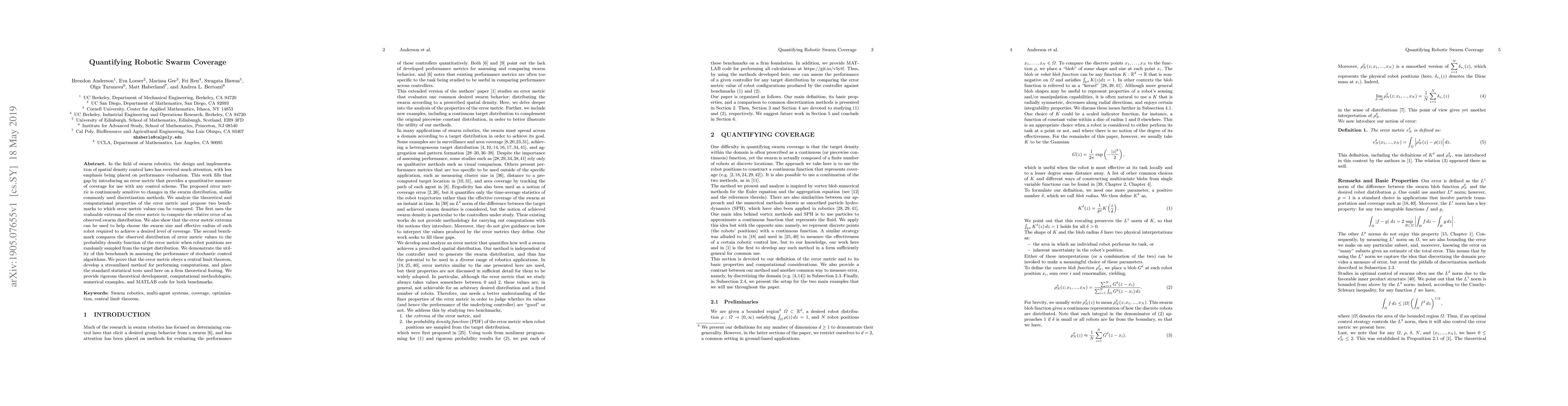 The paper introduces an error metric for quantifying robotic swarm coverage, analyzing its theoretical and computational properties, and proposing two benchmarks for performance evaluation.