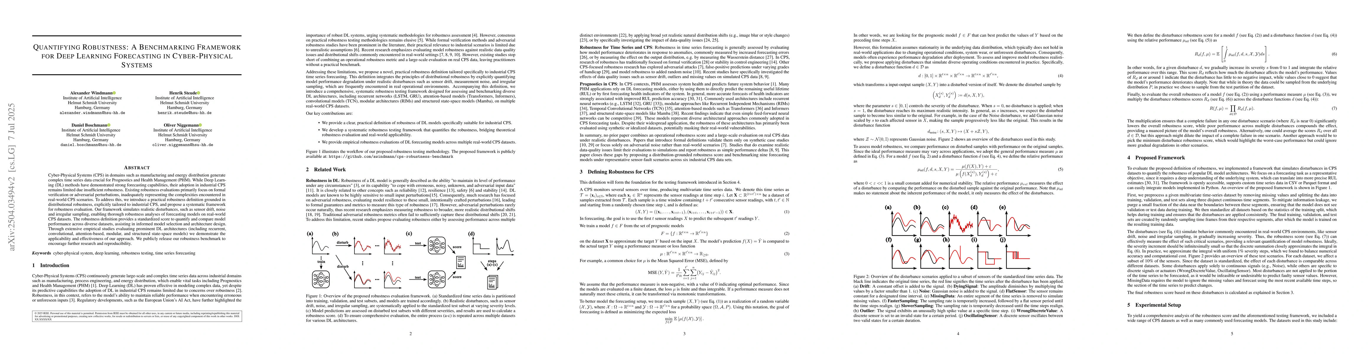 Cyber-Physical Systems (CPS) in domains such as manufacturing and energy distribution generate complex time series data crucial for Prognostics and Health Management (PHM). While Deep Learning (DL) methods have demonstrated strong forecasting capabilities, their adoption in industrial CPS remains limited due insufficient robustness. Existing robustness evaluations primarily focus on formal verification or adversarial perturbations, inadequately representing the complexities encountered in real-world CPS scenarios. To address this, we introduce a practical robustness definition grounded in distributional robustness, explicitly tailored to industrial CPS, and propose a systematic framework for robustness evaluation. Our framework simulates realistic disturbances, such as sensor drift, noise and irregular sampling, enabling thorough robustness analyses of forecasting models on real-world CPS datasets. The robustness definition provides a standardized score to quantify and compare model performance across diverse datasets, assisting in informed model selection and architecture design. Through extensive empirical studies evaluating prominent DL architectures (including recurrent, convolutional, attention-based, modular, and structured state-space models) we demonstrate the applicability and effectiveness of our approach. We publicly release our robustness benchmark to encourage further research and reproducibility.