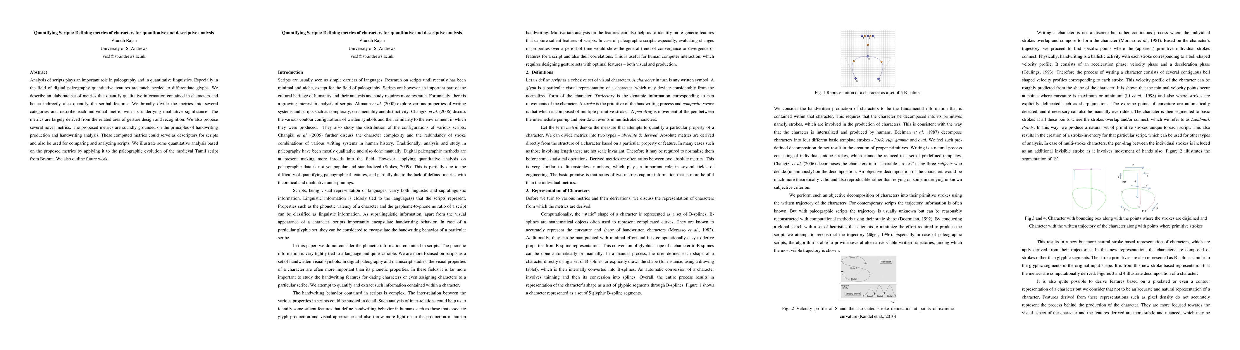 Analysis of scripts plays an important role in paleography and in quantitative linguistics. Especially in the field of digital paleography quantitative features are much needed to differentiate glyphs. We describe an elaborate set of metrics that quantify qualitative information contained in characters and hence indirectly also quantify the scribal features. We broadly divide the metrics into several categories and describe each individual metric with its underlying qualitative significance. The metrics are largely derived from the related area of gesture design and recognition. We also propose several novel metrics. The proposed metrics are soundly grounded on the principles of handwriting production and handwriting analysis. These computed metrics could serve as descriptors for scripts and also be used for comparing and analyzing scripts. We illustrate some quantitative analysis based on the proposed metrics by applying it to the paleographic evolution of the medieval Tamil script from Brahmi. We also outline future work.